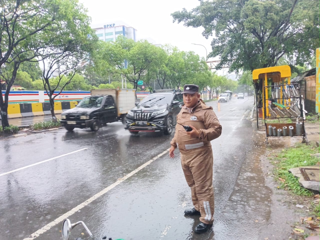 Setelah hujan yang mengguyur wilayah Cempaka Putih Aipda Amir melaksanakan patroli wilayah sekaligus pengecekan genangan air dan pohon tumbang.