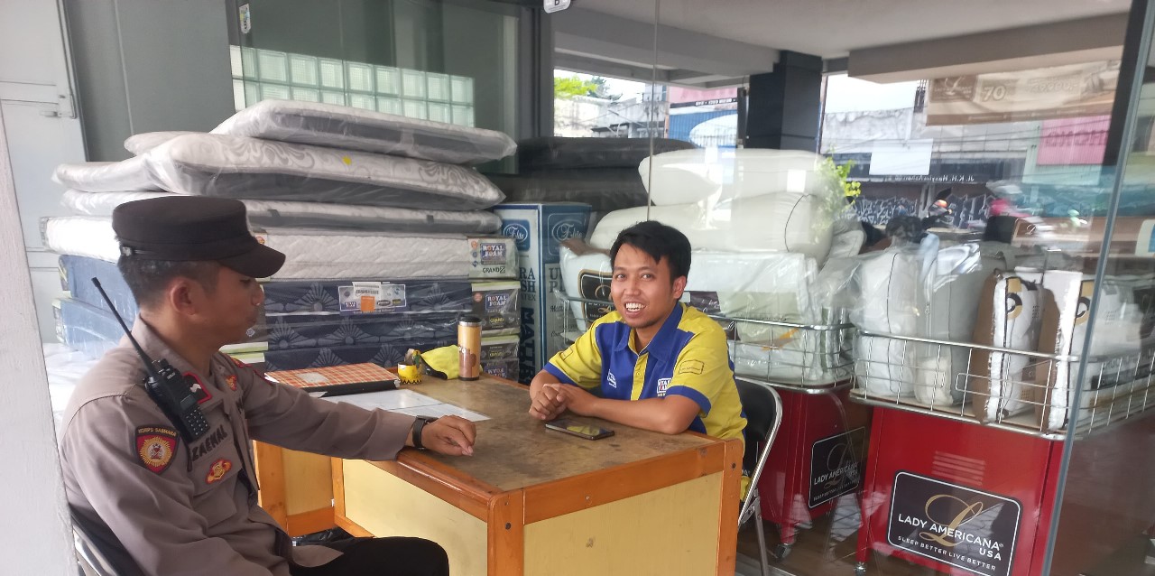 Aipda Zaenal menyampaikan pesan Kamtibmas dengan Bapak Jaya selaku petugas di pertokoan untuk bekerja sama menciptakan lingkungan agar tetap aman dan kondusif.