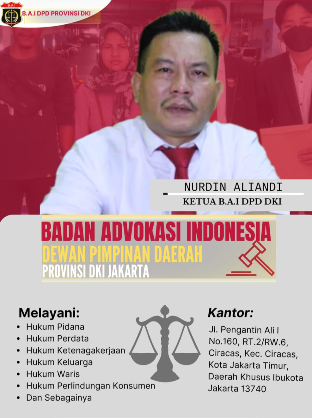 JAKARTA | POROSNUSANTARA.COM – Di tengah dinamika kehidupan perkotaan yang kompleks, kebutuhan akan layanan hukum yang andal dan terjangkau menjadi semakin penting. Badan Advokasi Indonesia (BAI) DPD Provinsi DKI Jakarta hadir sebagai lembaga yang berkomitmen untuk memberikan solusi hukum yang komprehensif bagi masyarakat Jakarta.