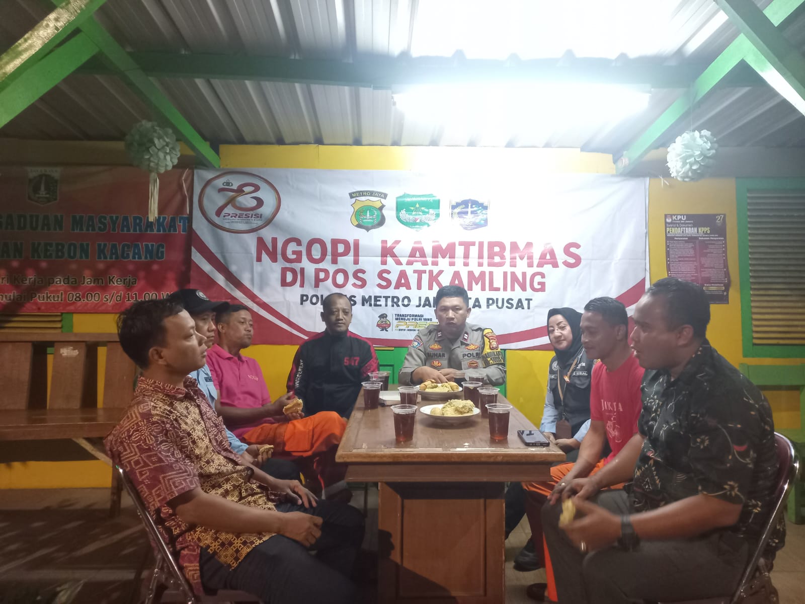 Ngopi Kamtibmas Bahas Kamtibmas dan menjelang Pilkada DKI Jakarta Tahun 2024, Ngopi Kamtibmas Pos Satkamling RW 07 Kebon Kacang peserta berjumlah 20 orang di hadiri oleh Bhabinkamtibmas, Satpol PP, Ketua RW, FKDM dan Warga.