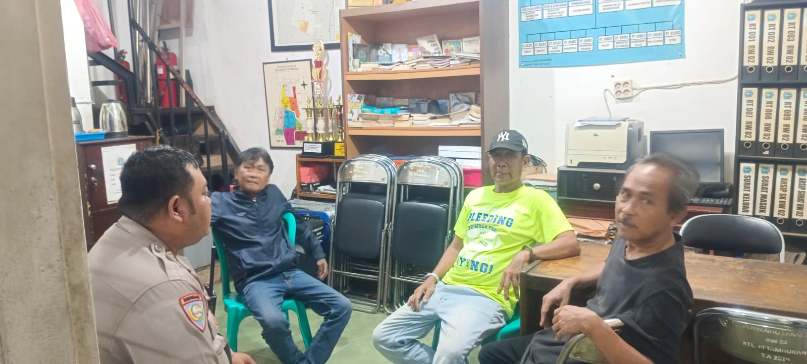 Dalam sambangi ke Poskamling bertemu dengan staf RW dan Petugas Siskamling Aipda Ginanjar berikan imbauan kamtibmas agar lebih ditingkatkan pengawasan kepada anak-anak dan tingkatkan patroli kewilayahan untuk antisipasi tawuran, selalu identifikasi gangguan kamtibmas, apabila ada tamu wajib lapor ke petugas siskamling agar diteruskan ke Ketua RT dan RW, lakukan pemeriksaan kepada setiap orang yang dicurigai dengan tetap sopan dan santun dan berikan imbauan kepada warga agar sepeda motor yang terparkir agar di kunci dan harus ditambah kunci ganda buat terhindar dari pencurian.