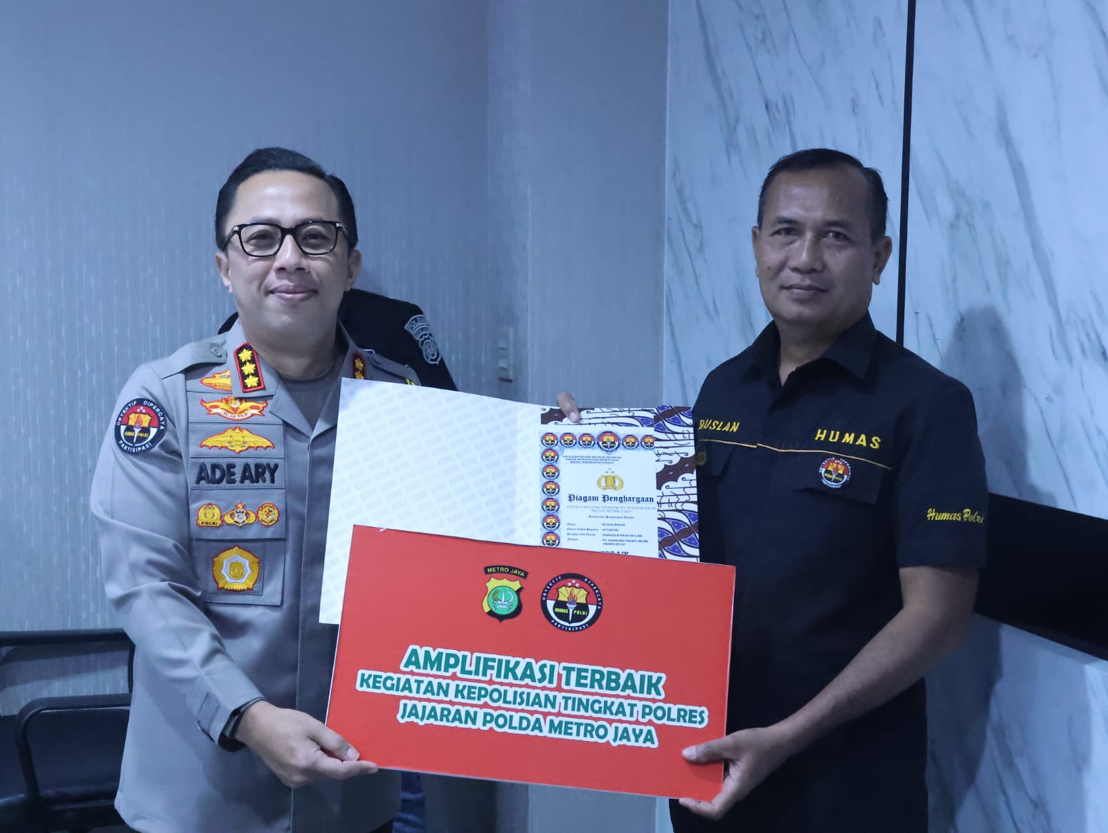 Dikesempatan yang sama Ade memberikan penghargaan kepada 5 Personel Humas berdedikasi tinggi yang menunjukkan kinerja dengan baik dalam menjalankan tugas Kepolisian.