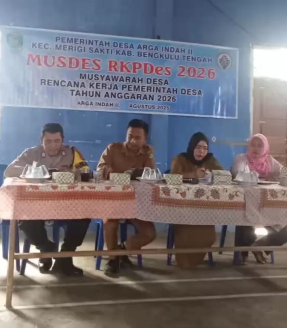 POROSNUSANTARA.COM | Bengkulu – Arga Indah II, 5 Agustus 2025, Pemerintah Desa ARGA INDAH II, Kecamatan MERIGI SAKTI, Kabupaten BENGKULU TENGAH, melaksanakan Musyawarah Desa (MUSDES) sebagai langkah awal dalam penyusunan Rencana Kerja Pemerintah Desa (RKP-DESA) untuk tahun anggaran 2026, Kegiatan ini diadakan di Balai Desa ARGA indah II dan dihadiri oleh camat kecamatan merigi sakti beserta staf, perangkat Desa ARGA indah II ,Babinkamtibmas tokoh masyarakat, dan warga setempat.