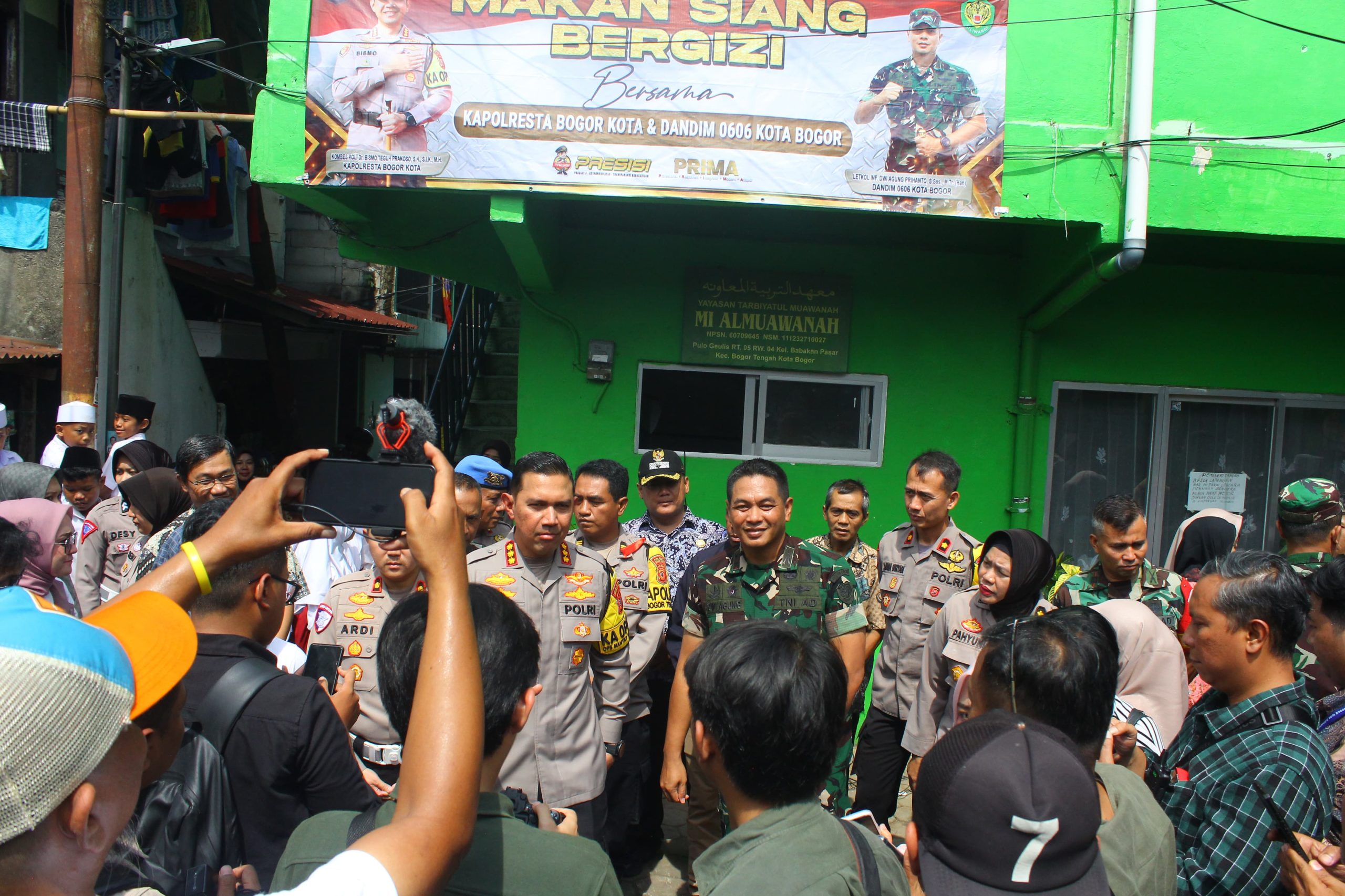 BOGOR | POROSNUSANTARA.COM – Dandim 0606/KB Letkol Inf Dwi Agung Prianto, S.Sos., M.Tr(Han) dan Kapolresta Bogor Kota Kombes Pol.Dr.Bismo Teguh Prakoso, S.H.S.I.K.M.H Mengadakan kegiatan sosial berupa makan siang bergizi gratis sebagai bentuk kepedulian terhadap kesehatan dan gizi anak-anak pada Jumat pagi, sekitar pukul 09.15 WIB, SD MI Al Muawanah dikampung Pulo Geulis, kelurahan Babakan Pasar, kecamatan Bogor Tengah, kegiatan ini melibatkan kurang lebih 75 siswa dari sekolah tersebut. Jumat (1/11/2024).