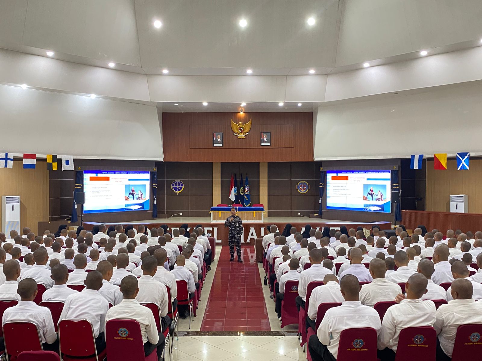 POROSNUSANTARA.COM | TNI AL, Aceh Besar,- Komandan Pangkalan TNI AL (Danlanal) Sabang Kolonel Laut (P) Sadimin, S.E., M.Tr. Opsla., menjadi narasumber pada kegiatan Masa Dasar Pembentukan Karakter (MADATUKAR) Taruna/i Poltekpel Malahayati Aceh Angkatan XIII Tahun 2025 yang diselenggarakan di Gedung Sultan Iskandar Muda, Politeknik Pelayaran (Poltekpel) Malahayati, Durung, Kecamatan Masjid Raya, Kabupaten Aceh Besar, Jum’at (17/10/2025).