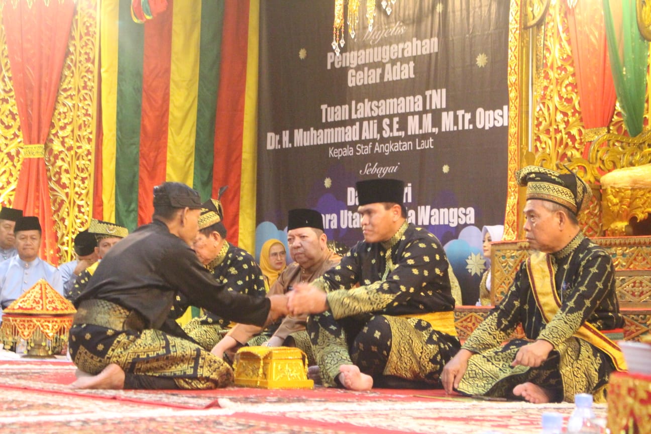 BELAWAN | POROSNUSANTARA.COM – Komandan Pangkalan Utama TNI Angkatan Laut I (Danlantamal I) Brigjen TNI (Mar) Jasiman Purba, S.E., CHRMP., didampingi Ketua Korcab I DJA I Ny. Othy Jasiman Purba, menghadiri Penganugerahan Gelar Adat Datuk Seri Segara Utama Setia Wangsa dari Lembaga Adat Melayu Riau (LAM) Riau kepada Kepala Staf Angkatan Laut (Kasal) Laksamana TNI Dr. Muhammad Ali, S.E., M.M., M.Tr. Opsla., didampingi Ketua Umum Jalasenastri Ny. Fera Mu