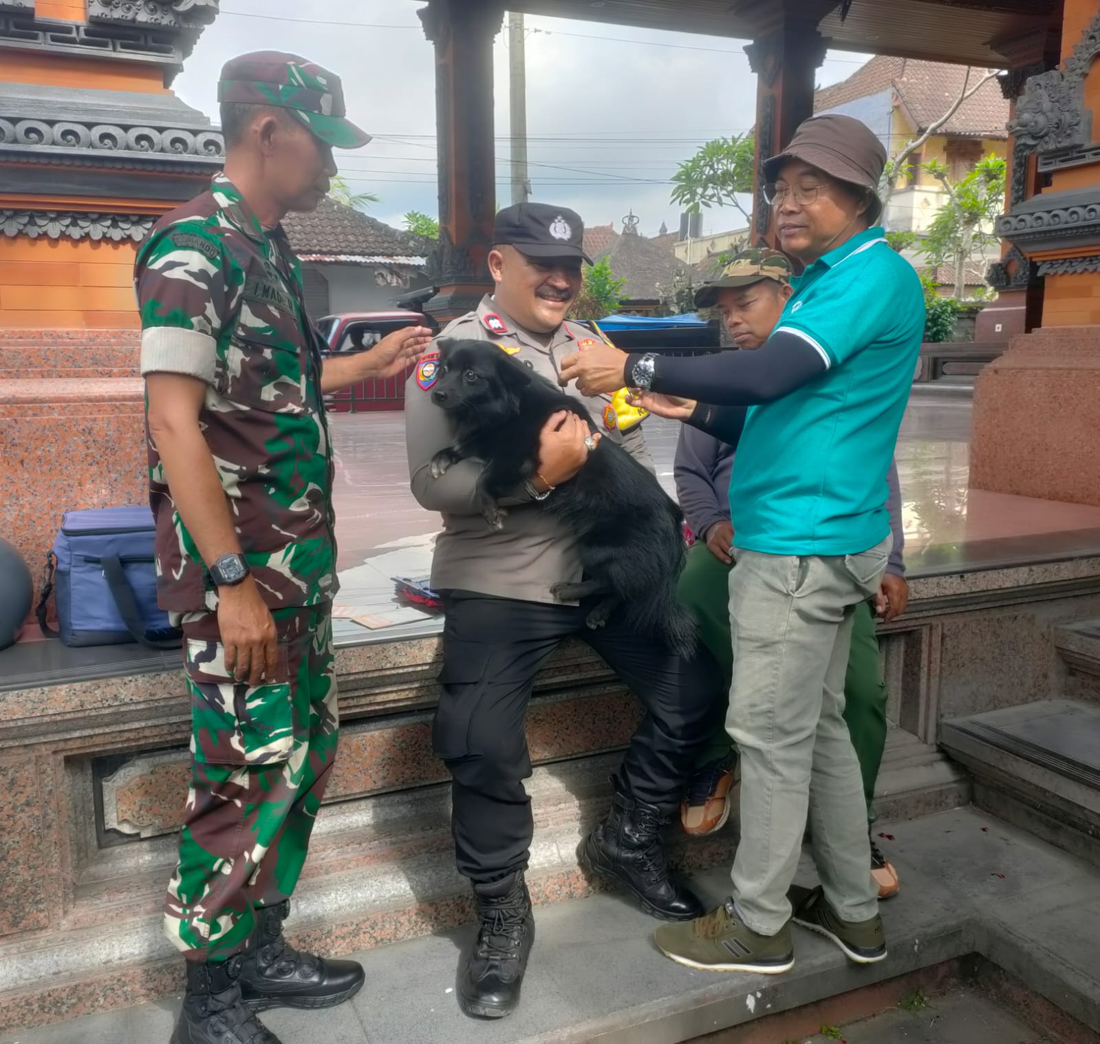 Dalam rangka mengantisipasi penyakit rabies, Bhabinkamtibmas Desa Singakerta Aiptu I Made Widastra bersama Babinsa Desa Singakerta Pelda Made Hubuh bersinergi mendampingi petugas Dinas Pertanian dan Pangan Kabupaten Gianyar melakukan penyuntikan vaksin rabies terhadap hewan peliharaan di desa binaan, Kamis (06/03/2025) pagi.