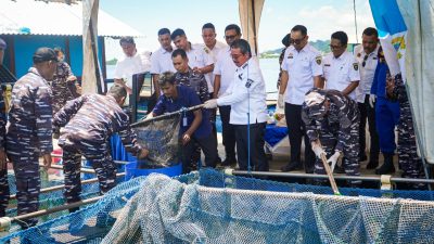 POROSNUSANTARA.COM | TNI AL, Ambon,- Komandan Komando Daerah Angkatan Laut (Dankodaeral) IX Laksamana Muda TNI Hanarko Djodi Pamungkas S.H., mengikuti kegiatan vicon panen serentak TNI AL, bertempat di Keramba Jaring Apung (KJA) Perairan Teluk Ambon, Rabu (29/10/2025).