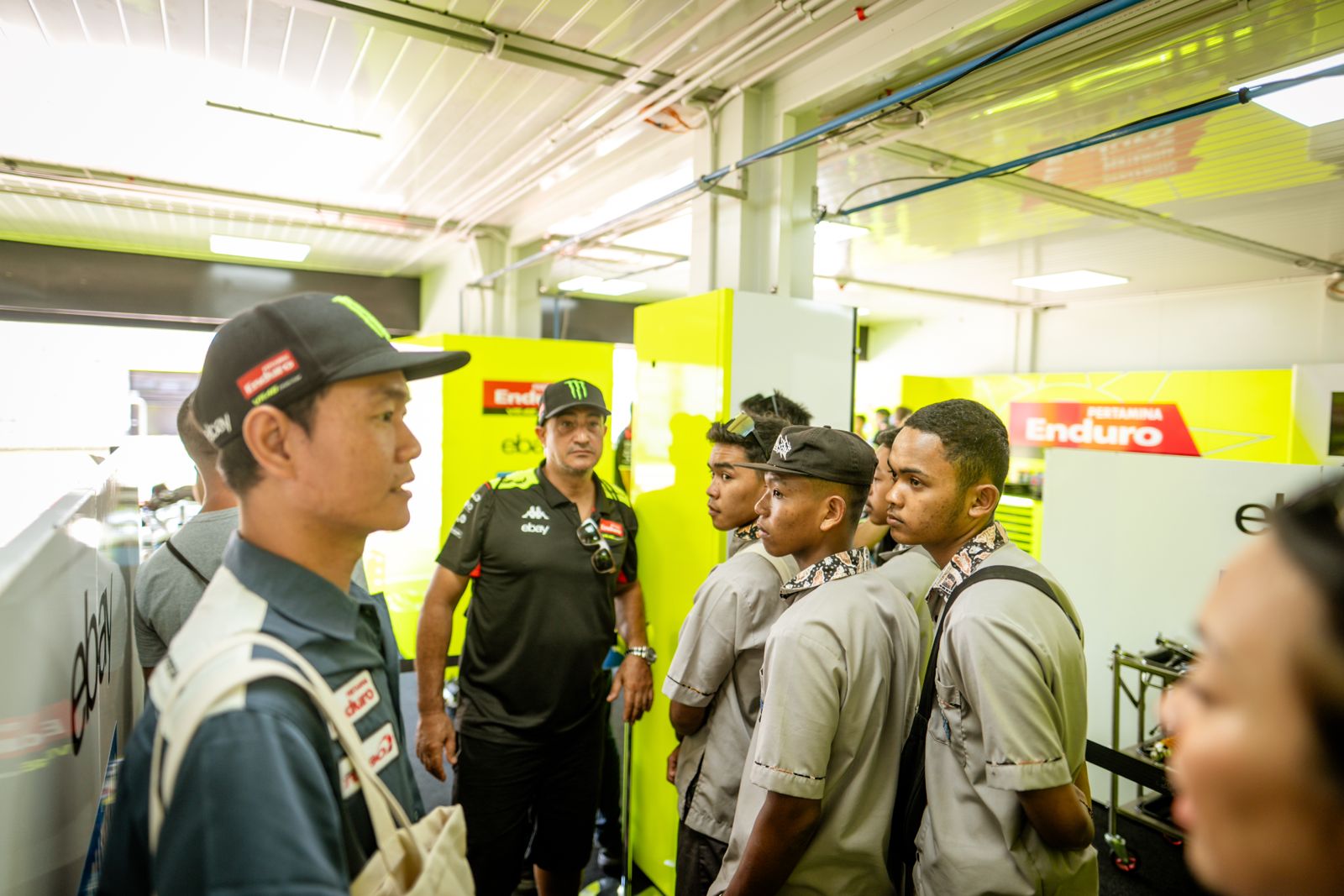 Para pelajar tidak hanya hadir sebagai penonton, tapi juga mendapatkan pengalaman pengalaman eksklusif mengeksplorasi area paddock. Mereka dapat melihat langsung persiapan motor tim mekanik, mempelajari detail teknis, dan berinteraksi dengan rider Pertamina Enduro VR46 Racing Team.
