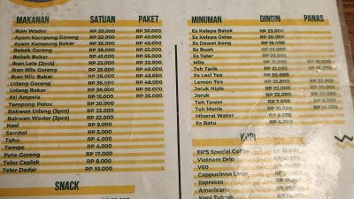 Selain menu utama, restoran ini juga menyediakan camilan seperti singkong goreng dan tape goreng cokelat keju, serta aneka minuman segar seperti es kelapa batok dan jus buah segar. B
