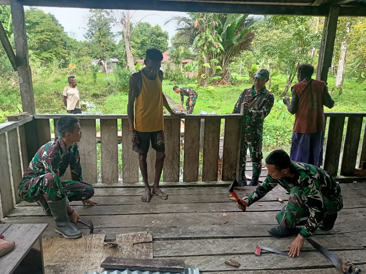 Selanjutnya, Pembinaan Teritorial yang terjalin baik antara Prajurit TNI dengan Pimpinan dan Tokoh Masyarakat Kampung Mumugu, menghasilkan pelaksanaan gotong royong yang berjalan dengan aman dan lancar serta melibatkan banyak pihak yang dapat mempercepat proses perbaikan sekolah tersebut.