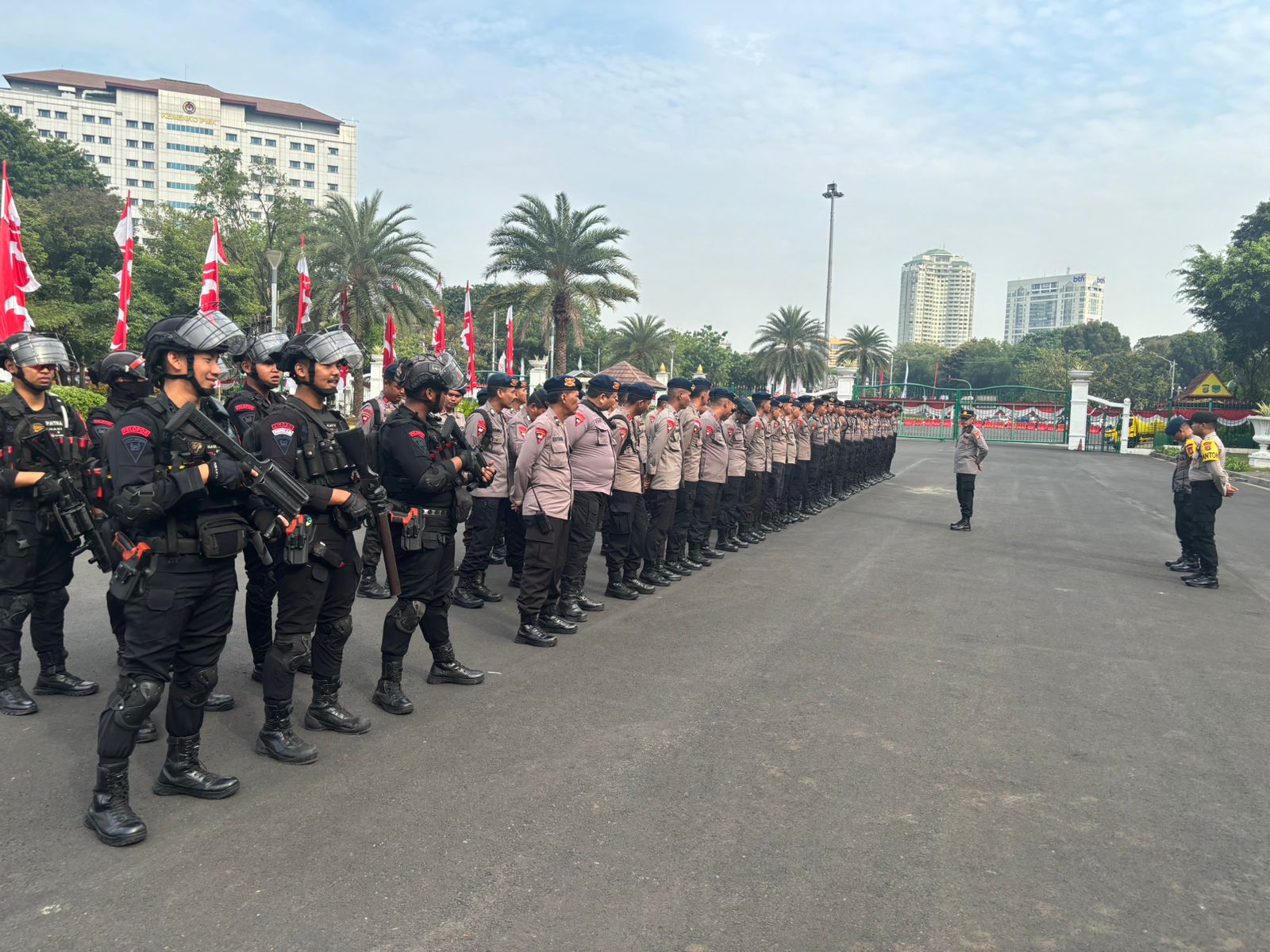 TARA.COM – Iptu Agusni Kapolsubsektor Roxy Polsek Metro Gambir pimpin apel pengamanan rencana aksi unjuk rasa di depan te