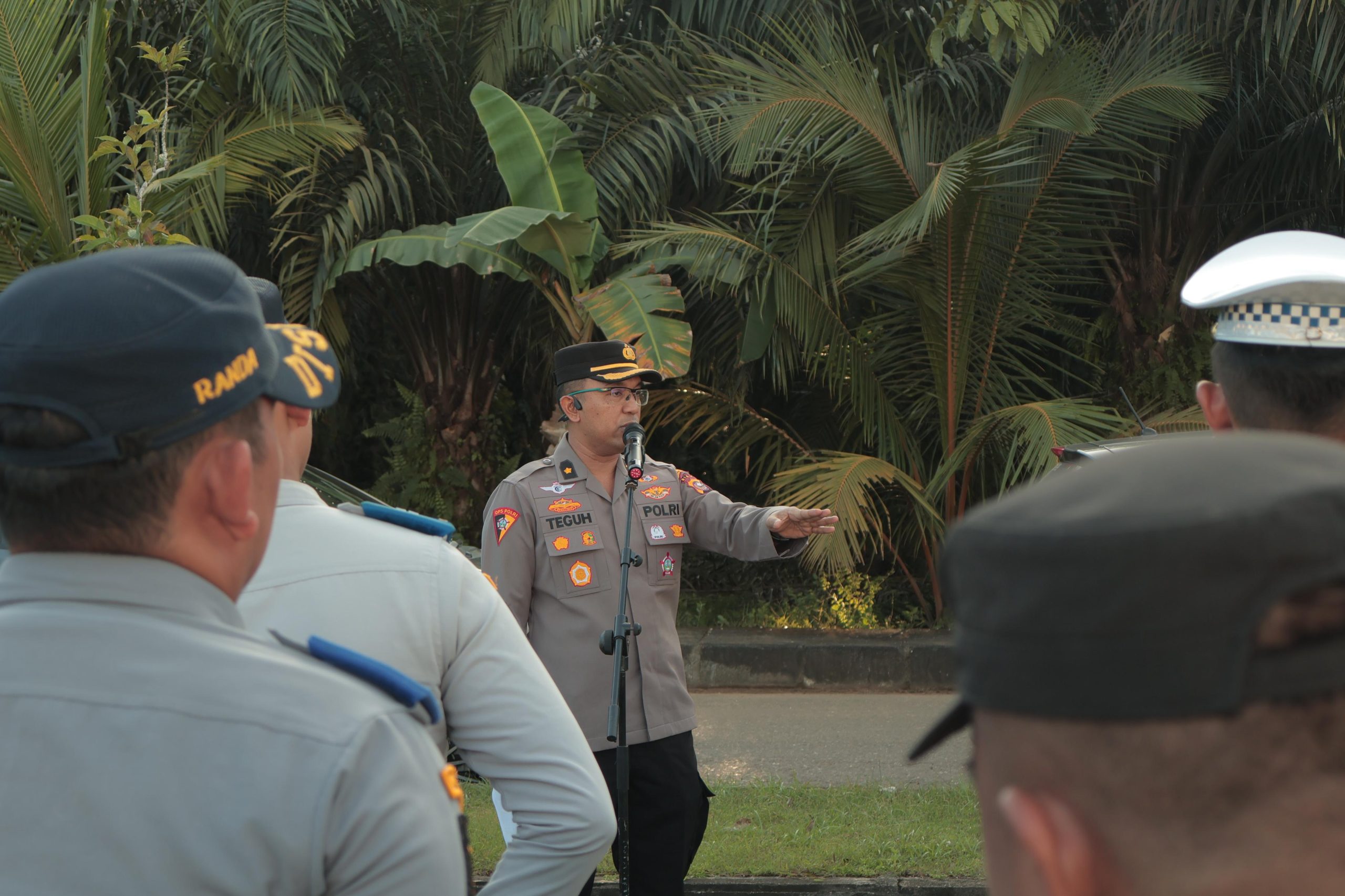 Kapolres Kuantan Singingi AKBP Angga F. Herlambang, S.I.K., S.H., melalui KOMPOL Teguh Wiyono menyampaikan sejumlah poin penting terkait kesiapan dan pembagian tugas pengamanan. Ia mengucapkan terima kasih kepada seluruh peserta apel yang telah hadir dan menunjukkan komitmennya dalam menjaga keamanan kegiatan.