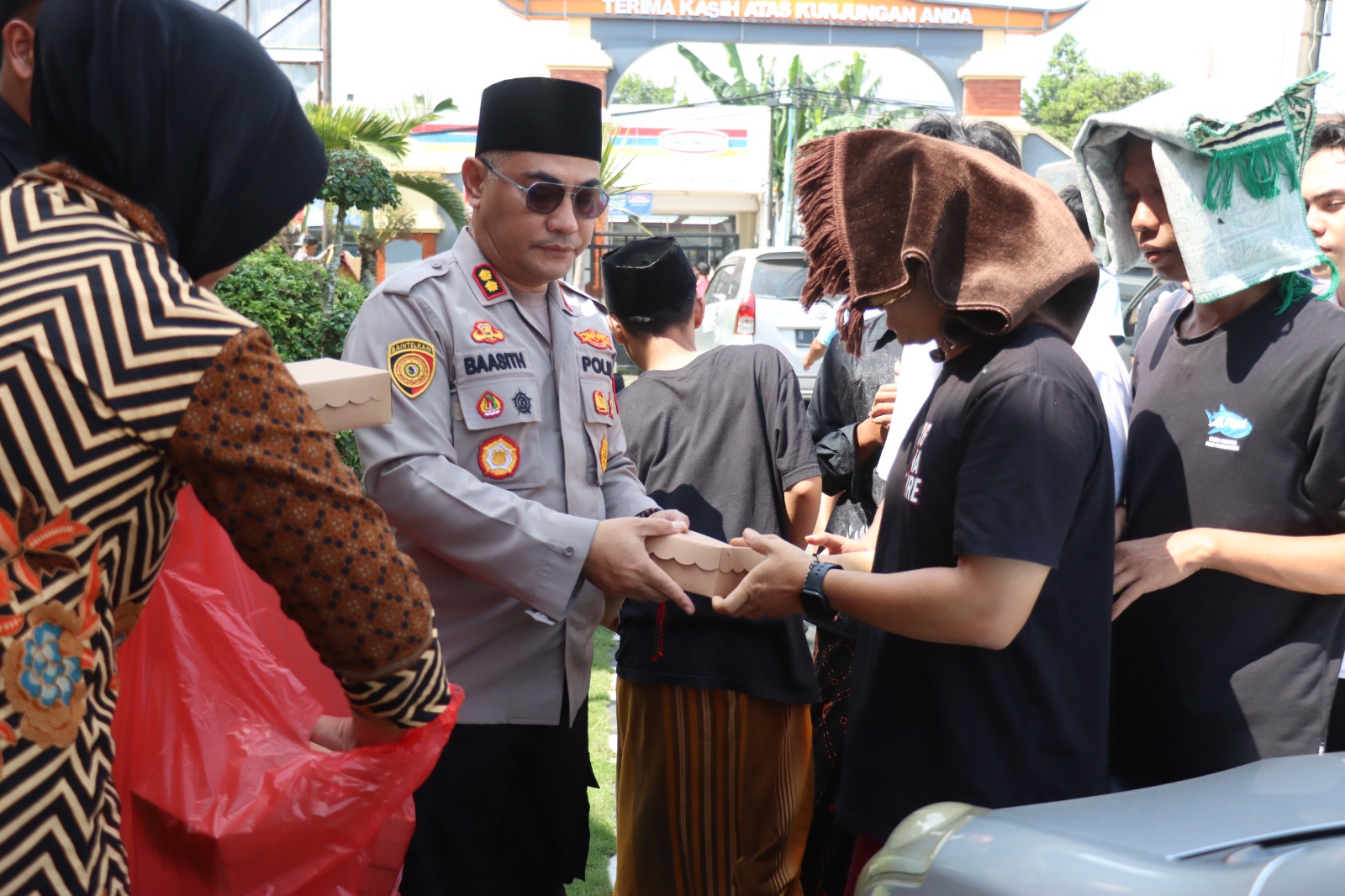 Dengan mengenakan seragam dinas dan senyum yang ramah, AKBP Eka Baasith Syamsuri turun langsung membagikan nasi kotak kepada para jamaah. Kehadirannya yang bersahaja dan menyatu di tengah masyarakat menjadi simbol keteladanan pemimpin yang merakyat, mengedepankan nilai-nilai kepedulian dan spiritualitas.