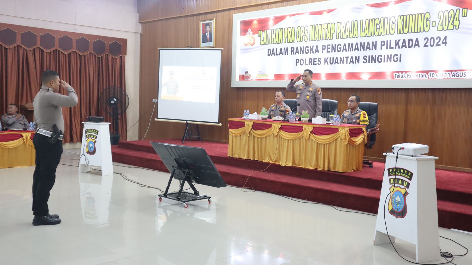 Kapolres Kuansing AKBP Pangucap Priyo Soegito, S.I.K., M.H., dalam sambutannya sekaligus pembukaan mengucapkan “Terimakasih kepada seluruh personil yang telah hadir pada acara Latihan Pra Operasi Mantap Praja Lancang Kuning 2024 dalam Rangka Pengamanan Pilkada tahun 2024, Operasi Mantap Praja Lancang Kuning 2024 dalam Rangka Pengamanan Pilkada tahun 2024 akan dimulai pada tanggal 24 Agustus 2024, Operasi Mantap Praja Lancang Kuning 2024 merupakan Pengamanan Pemilihan Gubernur/Wakil Gubernur dan Bupati/Wakil Bupati,” jelas Kapolres.