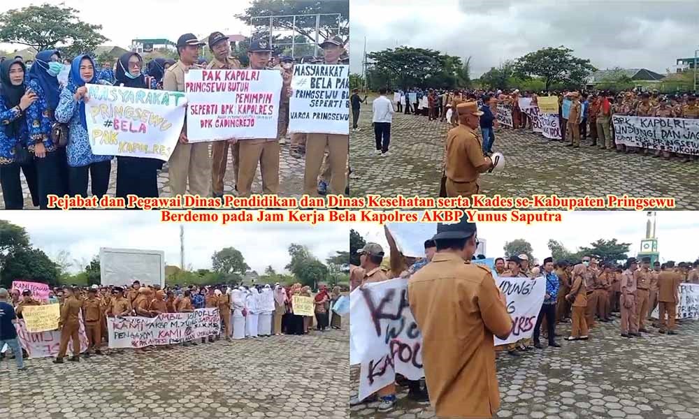 LAMPUNG | POROSNUSANTARA.com – Sejumlah pejabat dan pegawai ASN dari tiga instansi berbeda menggelar aksi damai di Pringsewu, Lampung, Senin, 17 Maret 2025. Aksi tersebut menuntut agar Kapolres Pringsewu, AKBP M Yunus Saputra, tidak dicopot dari jabatannya. Para demonstran menyuarakan orasi dengan tujuan mempertahankan posisi sang Kapolres. Mereka mengenakan pakaian seragam instansi masing-masing, yakni Dinas Pendidikan Pringsewu, Dinas Kesehatan Pringsewu, dan para Kepala Pekon (Kepala Desa) se-Kabupaten Pringsewu.