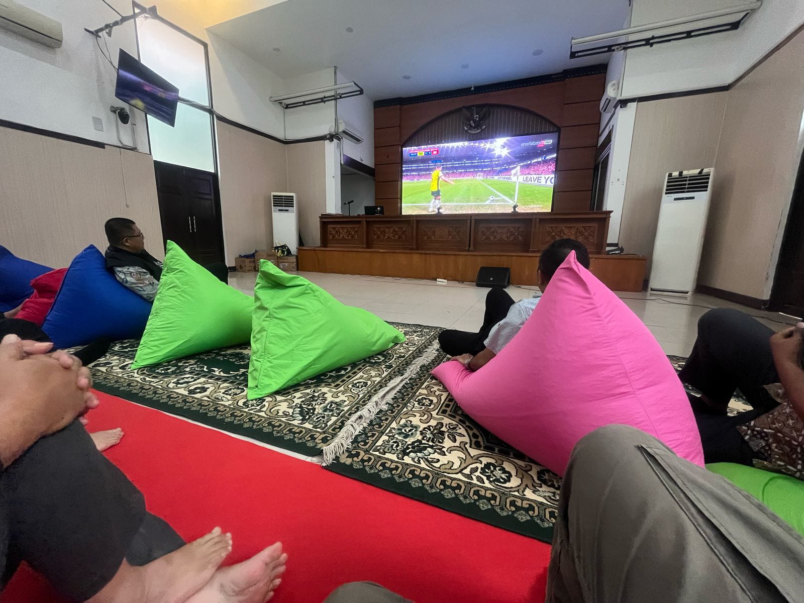 Nobar lanjutan matchday ketujuh Putaran Ketiga Kualifikasi Piala Dunia 2026 zona Asia itu digelar di ruang sidang utama PN Jaksel, Jalan Ampera Raya, Jaksel, Kamis (20/3/2025). Ruang sidang diset senyaman mungkin. Kursi sidang dikeluarkan. Layar besar di dinding belakang hakim jadi videotron nobar. Karpet digelar. Sebanyak 18 bean bag dipasang agar penonton lebih nyaman nobar.