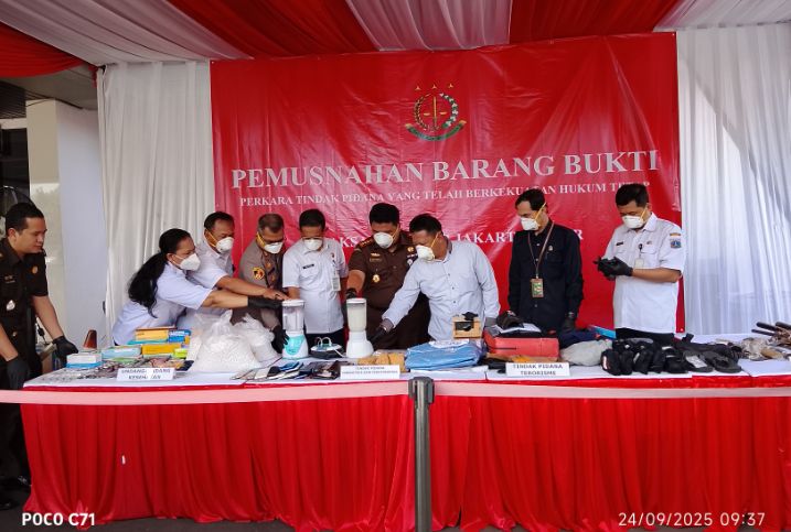 “Terima kasih, pagi ini, Rabu 24 September 2025, Kejaksaan Negeri Jakarta Timur melakukan pemusnahan barang bukti dari berbagai perkara. Dari tindak pidana narkotika terdapat 82 perkara, tindak pidana terorisme 3 perkara, serta tindak pidana umum lainnya sebanyak 85 perkara. Selain itu, kami juga memusnahkan sekitar 23.000 butir obat-obatan tanpa izin edar,” ujar Satya.