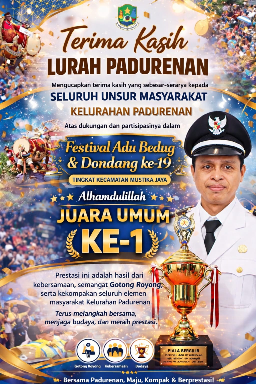 KOTABEKASI|POROSNUSANTARA.COM – Kelurahan Padurenan berhasil meraih Juara Umum Ke-1 dalam ajang Festival Adu Bedug dan Dondang ke-19 tingkat Kecamatan Mustikajaya tahun 2026, mengungguli peserta dari empat kelurahan yang turut berkompetisi, yakni Kelurahan Mustika Jaya, Kelurahan Cimuning, Kelurahan Padurenan, dan Kelurahan Mustikasari.