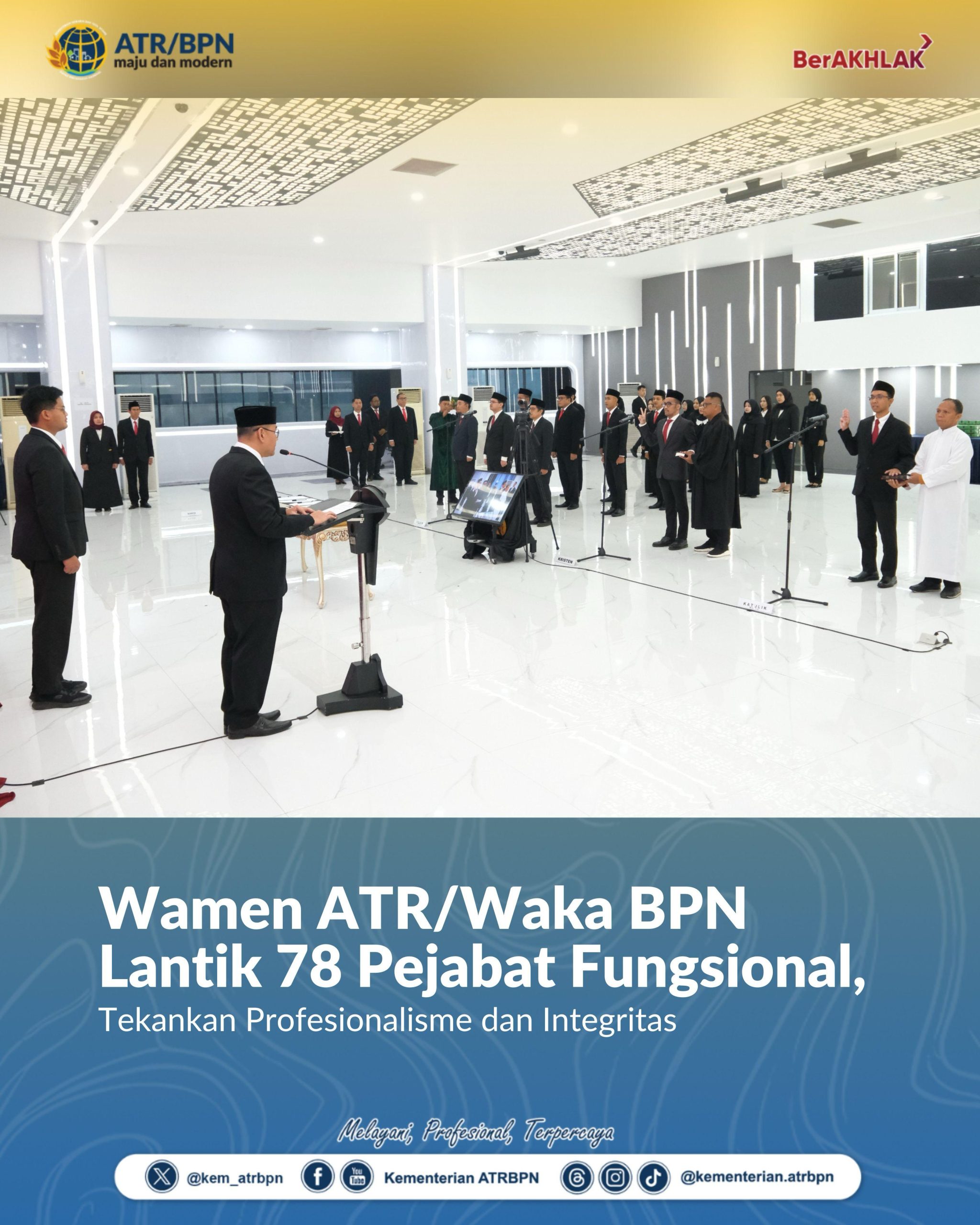 “Saya berpesan agar sumpah dan janji jabatan yang telah Saudara-saudari lakukan dilaksanakan dengan sebaik-baiknya. Pengangkatan dalam Jabatan Fungsional didasarkan pada kebutuhan organisasi yang juga mempertimbangkan aspek integritas, moralitas, kompetensi, serta penerapan pola karier Pegawai Negeri Sipil (PNS),” ujar Wakil Menteri (Wamen) ATR/Wakil Kepala (Waka) BPN, Ossy Dermawan.
