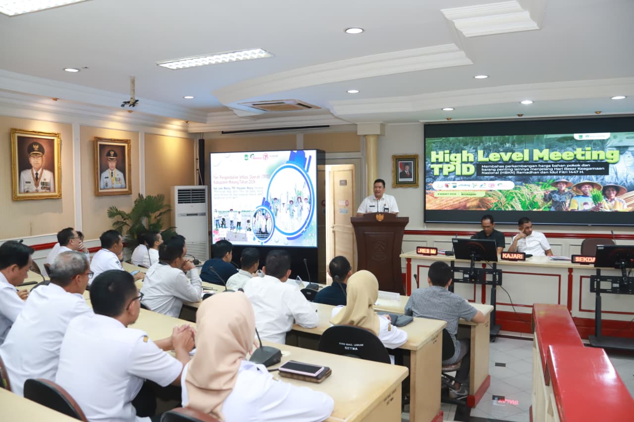 Malang | POROSNUSANTARA .COM – Upaya pengendalian inflasi digelar Pemerintah Kabupaten Malang bersama Tim Pengendalian Inflasi Daerah (TPID) melalui High Level Meeting yang membahas perkembangan harga bahan pokok dan barang penting lainnya menjelang Hari Besar Keagamaan Nasional (HBKN) Ramadan dan Idul Fitri 1447 H, Rabu (4/3). Rapat yang dipimpin oleh Sekretaris Daerah Dr. Ir. Budiar, M.Si mewakili Bupati Malang tersebut digelar di Ruang Rapat Anusapati dengan menghadirkan unsur Bank Indonesia Perwakilan Malang, Badan Pusat Statistik (BPS) Malang, Forkopimda, Bulog, Pertamina, Hiswana migas, Kamar Dagang Indonesia Kabupaten Malang, serta perangkat daerah terkait.