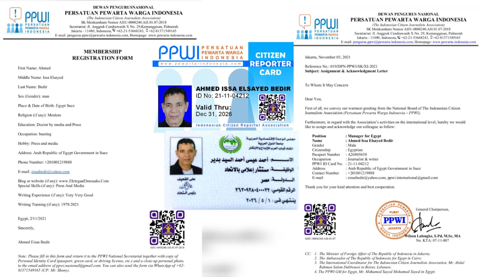 Dalam langkah strategis memperkuat jejaring internasionalnya, Persatuan Pewarta Warga Indonesia (PPWI) resmi menetapkan Ahmed Issa Elsayed Bedir sebagai Manajer PPWI untuk Mesir. Penunjukan ini tertuang dalam Surat Penugasan dan Pengakuan No. 019/DPN-PPWI/SK/XI-2021 yang ditandatangani langsung oleh Ketua Umum PPWI, Wilson Lalengke, S.Pd, M.Sc, M.A.