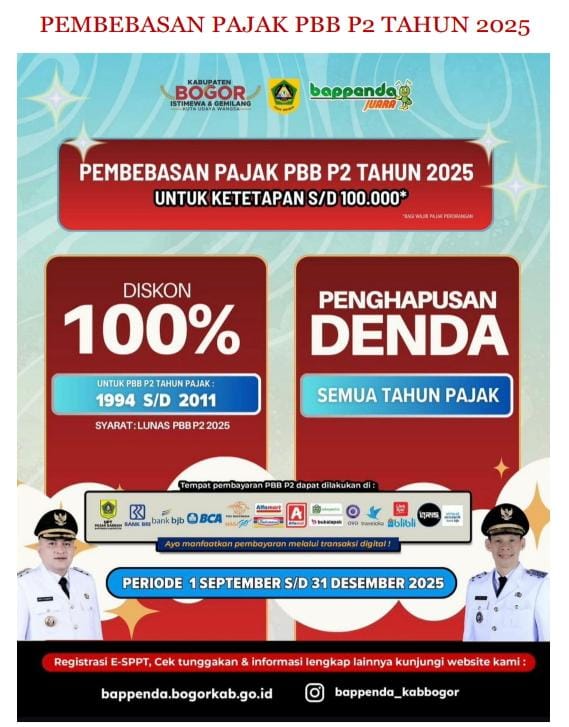 Pemerintah Kabupaten Bogor melalui Bappenda Kabupaten Bogor memperpanjang Relaksasi Pajak Daerah, antara lain: Program pembebasan pajak PBB P2 di Kabupaten Bogor tahun 2025 merupakan terobosan besar yang dihadirkan pemerintah daerah untuk memberikan keringanan kepada masyarakat, khususnya wajib pajak perorangan dengan nilai ketetapan hingga Rp100.000,-