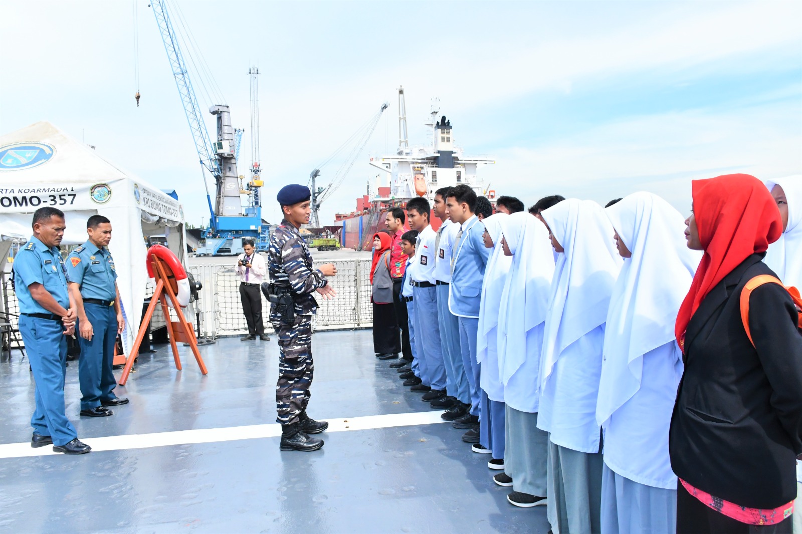 POROSNUSANTARA.COM | TNI AL, Belawan,- Komando Daerah TNI Angkatan Laut (Kodaeral I) menerima kunjungan siswa-siswi SMA Hikmatul Fadhilah di Mako Kodaeral I dan KRI Bung Tomo-357 yang sandar di Dermaga 200 Ujung Baru Pelabuhan Umum Belawan, Senin (25/8/2025).
