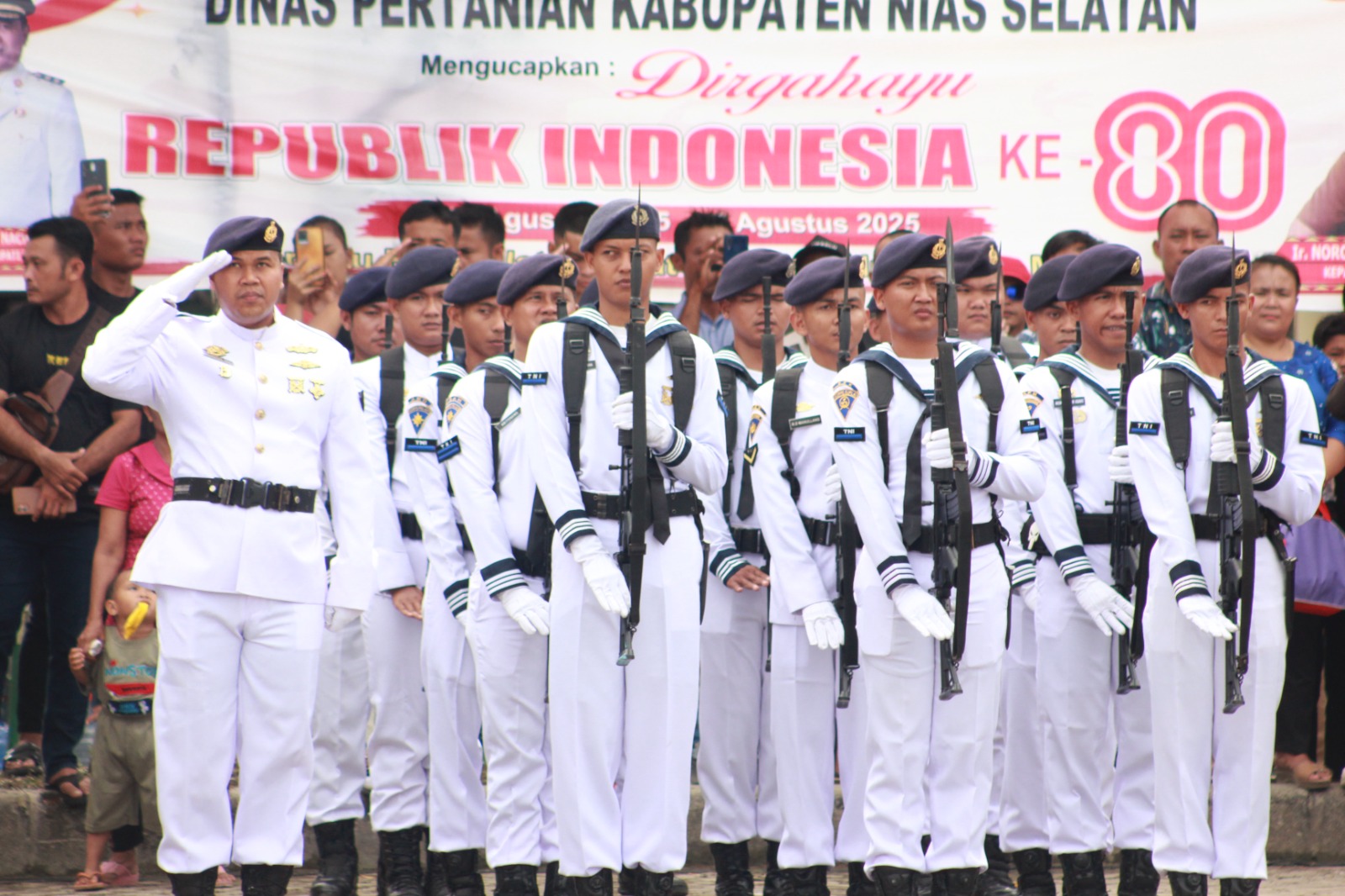 POROSNUSANTARA.COM | TNI AL, Nias Selatan,- Komandan Lanal Nias Letkol Laut (P) Lexy Effraim Dumais, S.E., M.Tr.Opsla., didampingi istri beserta Prajurit Lanal Nias mengikuti Upacara Pengibaran Bendera Merah Putih dalam Rangka Peringatan HUT Ke-80 Kemerdekaan RI di Kabupaten Nias Selatan Tahun 2025. Bertindak selaku Inspektur Upacara Bupati Nias Selatan, Minggu (17/8/2025).