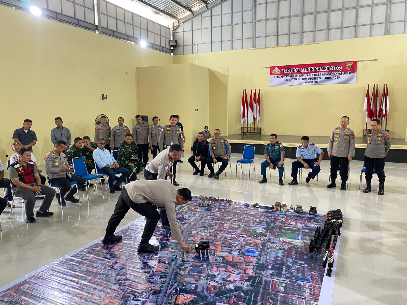 POROSNUSANTARA.COM | TNI AL, Sabang,- Dalam rangka menghadapi aksi unjuk rasa di Kota Banda Aceh, Polresta Banda Aceh menggelar TFG (_Tactical Floor Game_) dan Latihan Sistem Pengamanan Kota (Sispamkota) yang dihadiri Komandan Lanal Sabang Kolonel Laut (P) Sadimin, S.E.,M.Tr. Opsla., bertempat di Polresta Banda Aceh, Kp. Baru, Kecamatan Baiturrahman, Kota Banda Aceh, Minggu (31/8/2025).