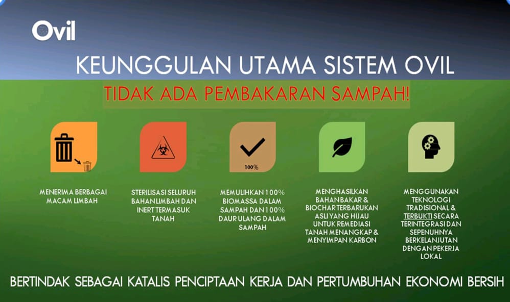 Dengan sistem Smelter Sampah Ovil, seluruh sampah dapat diolah menjadi listrik, gas, dan bahan bakar secara otomatis tanpa menimbulkan bau atau pencemaran. Teknologi ini bekerja nonstop 24 jam dengan hanya satu kali start mesin, dan hasil energinya dapat dijual kembali ke pemerintah dengan harga ekonomis untuk mendukung perekonomian daerah.