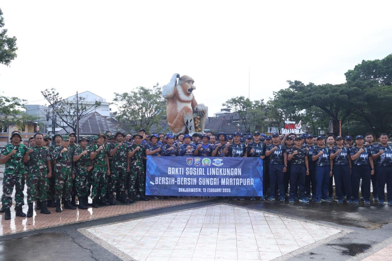 TNI AL, Banjarmasin – POROSNUSANTARA.COM | Dalam rangka peduli kebersihan di wilayah Perairan, Lanal Banjarmasin bersama Korem 101/Antasari dan Ditpolairud Polda Kalsel melaksanakan kegiatan Bakti Sosial Lingkungan Bersih-bersih Sungai Martapura, bertempat di Jalan Kapten Piere Tendean, Patung Bekantan, Kota Banjarmasin, Provinsi Kalimantan Selatan, Jumat (13/02/2026).