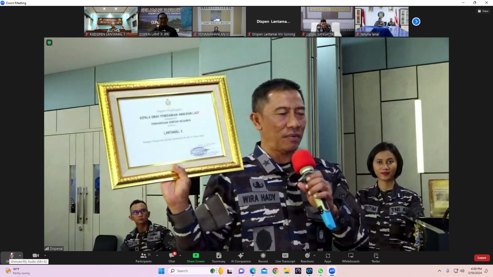 TARA.COM – Kadispen Lantamal I Letkol Laut (S) Edy Sahputra mengikuti Rapat Kerja Teknis Penerangan (Rakernispen) TNI AL Tahun 2024, dipimpin dan dibuka oleh Kadispenal Laksma TNI I Made Wira Hady Arsanta W, M.Tr.Opsla., dengan tema “Peran Penerangan TNI AL Dalam Mewujudkan Pertahanan Laut Yang Tangguh Untuk Indonesia Maju” melalui vicon, bertempat di Ruang Puskodal Lantamal I, Jalan Serma Hanafiah No.01, Belawan, Sumatera Utara, Selasa (19/3/2024).