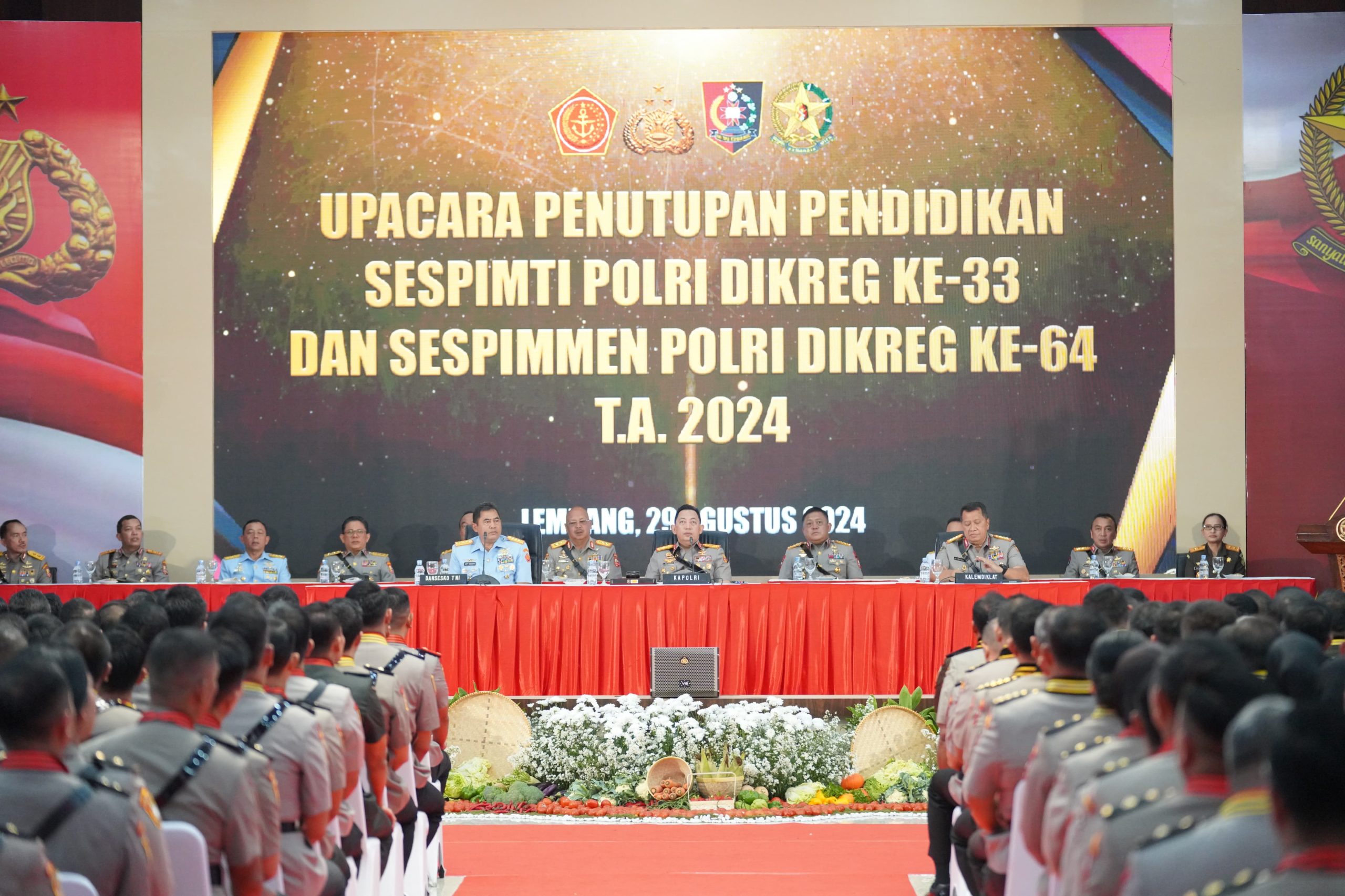 JAKARTA | POROSNUSANTARA.COM – Kapolri Jenderal Polisi Drs. Listyo Sigit Prabowo menutup pendidikan Sespimti Dikreg ke-33 dan Sespimen Dikreg ke-64 Tahun Ajaran 2024. Turut hadir dalam acara sejumlah pejabat utama Mabes Polri dan tentunya Kepala SSP Lemdiklat Polri Irjen. Pol. Chrysnanda Dwilaksana.