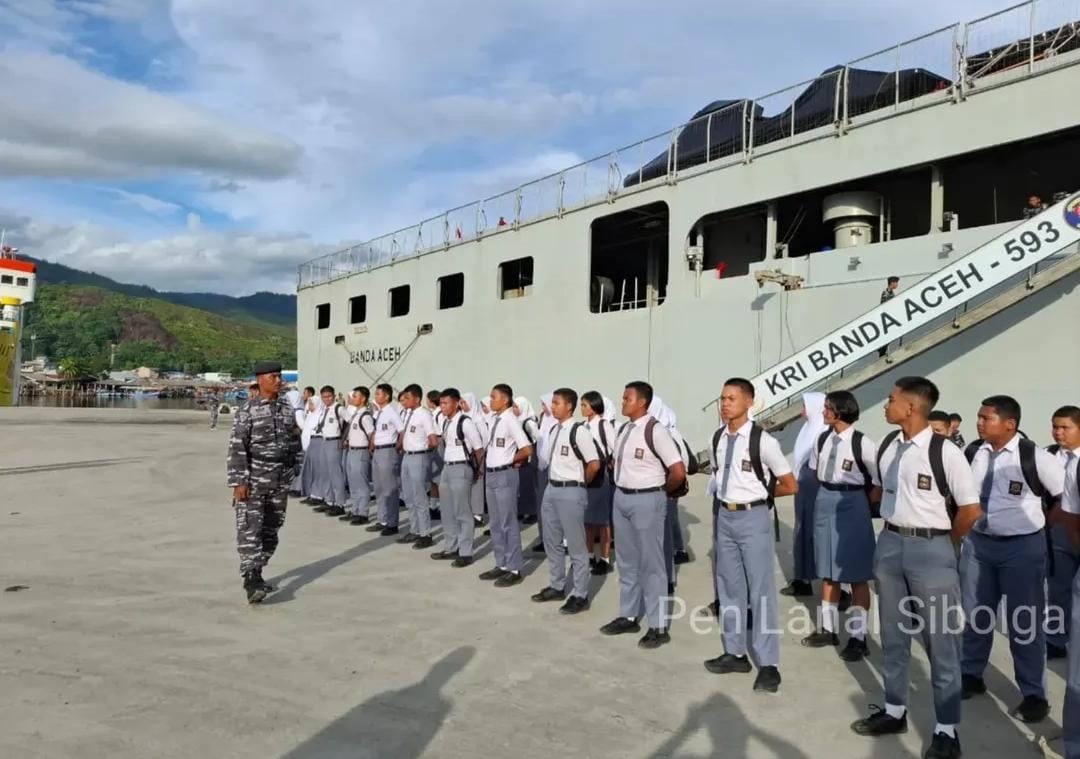 POROSNUSANTARA.COM | TNI AL, Sibolga,- Dalam rangka memperkenalkan dunia kemaritiman kepada generasi muda, KRI Banda Aceh-593 yang tengah sandar di Pelabuhan Sibolga melaksanakan kegiatan Open Ship dengan menerima kunjungan siswa-siswi SMA Negeri 1 Matauli Pandan, bertempat di Pelabuhan Pelindo, Sibolga, Selasa (02/09/2025).