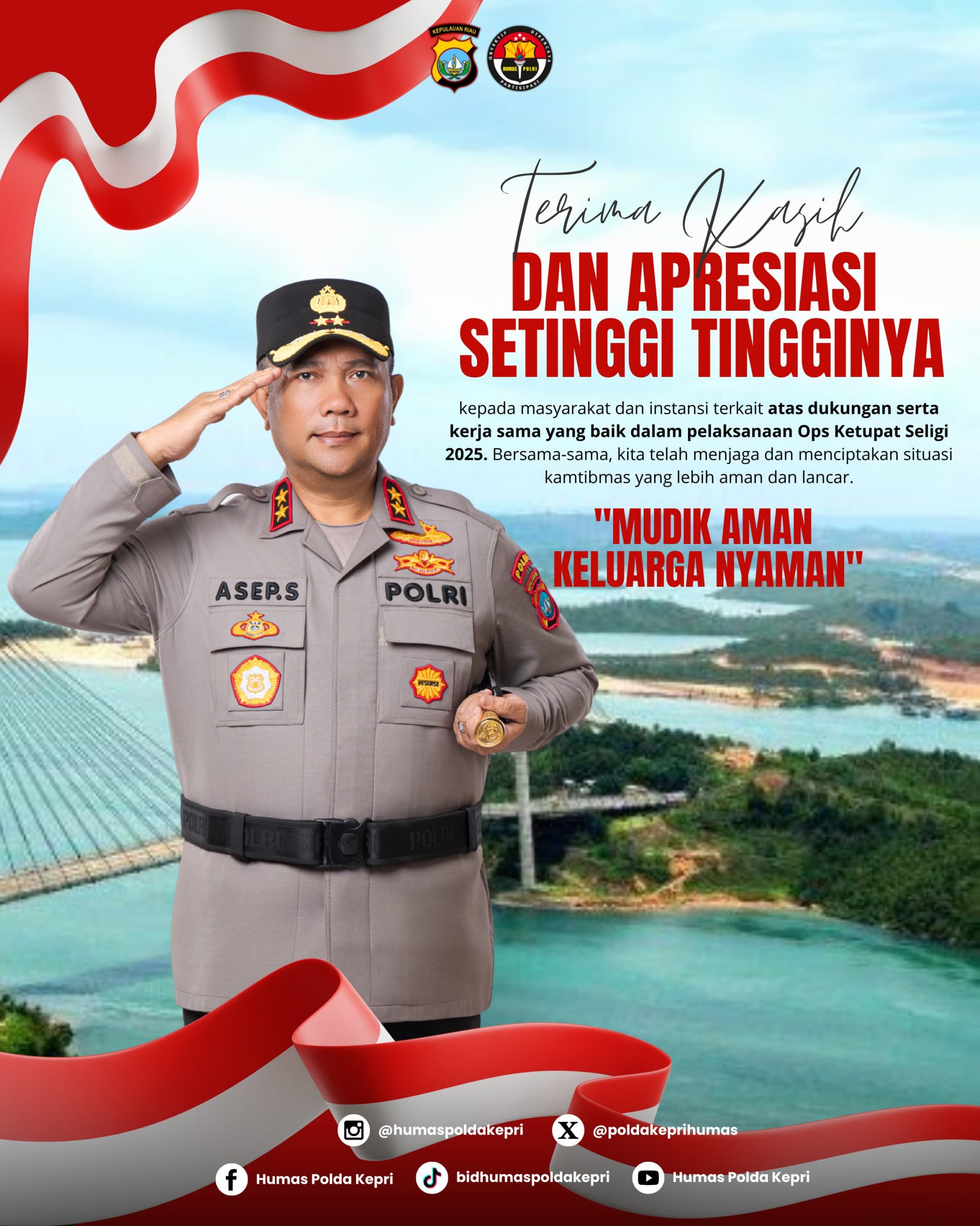 Batam, porosnusantara.com- Operasi Ketupat Seligi 2025 yang dilaksanakan oleh Polda Kepri dalam rangka pengamanan Hari Raya Idul Fitri 1446 H resmi berakhir. Operasi yang berlangsung selama 14 hari yang dimulai dari tanggal 26 Maret 2024 sampai dengan 6 April 2024, telah berjalan dengan sukses dalam mengamankan arus mudik dan balik Lebaran di wilayah hukum Polda Kepri. Hal tersebut disampaikan oleh Kapolda Kepri Irjen. Pol. Asep Safrudin, S.I.K., M.H., pada Hari kamis (10/4/2025).
