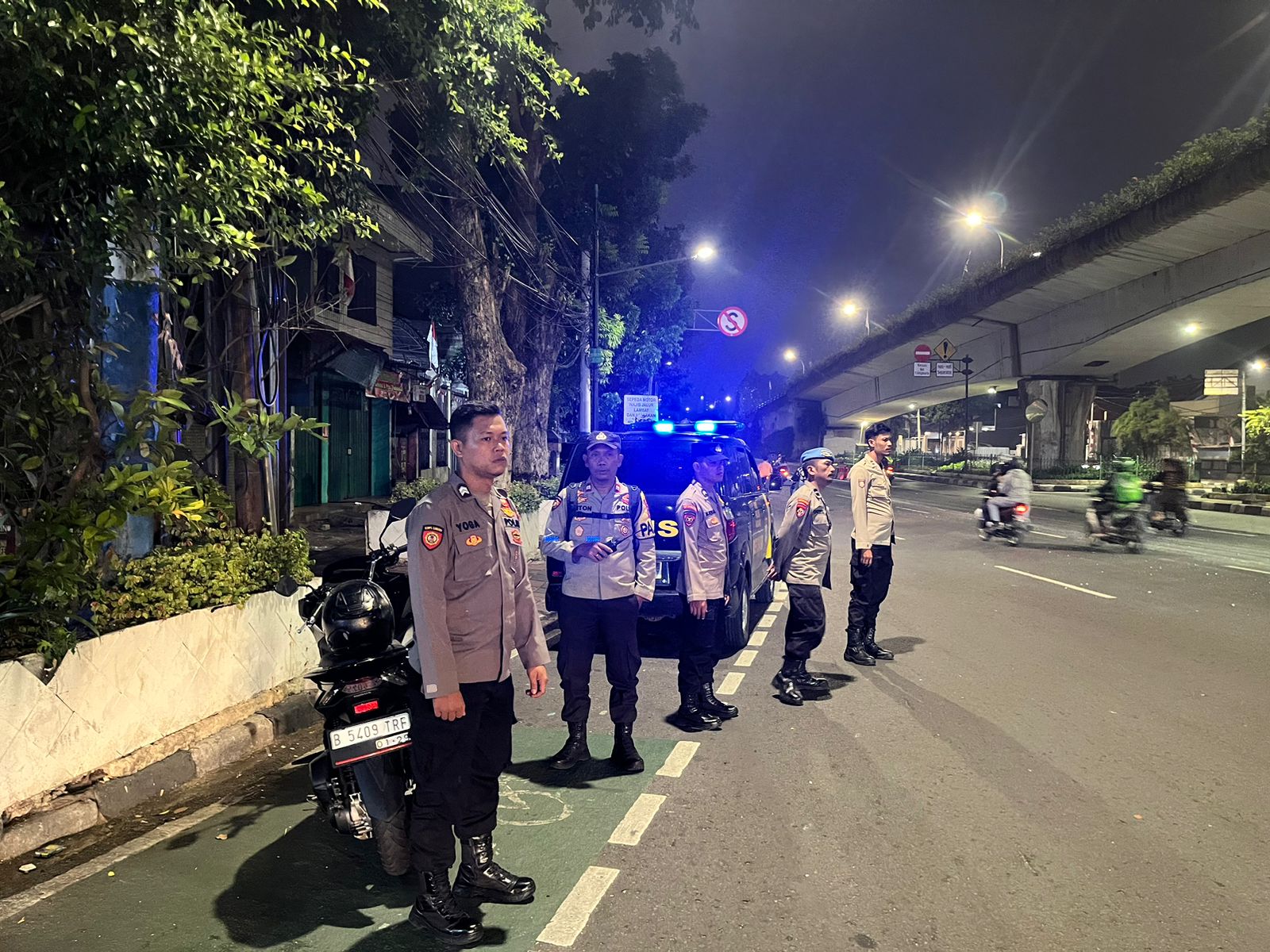 Anggota Patroli dan Anggota Propam, melaksanakan Patroli Strong Points antisipasi kerawanan wilayah malam hari di titik-titik rawan tawuran di wilayah Johar Baru Jakarta Pusat. Sabtu (3/8/2024)
