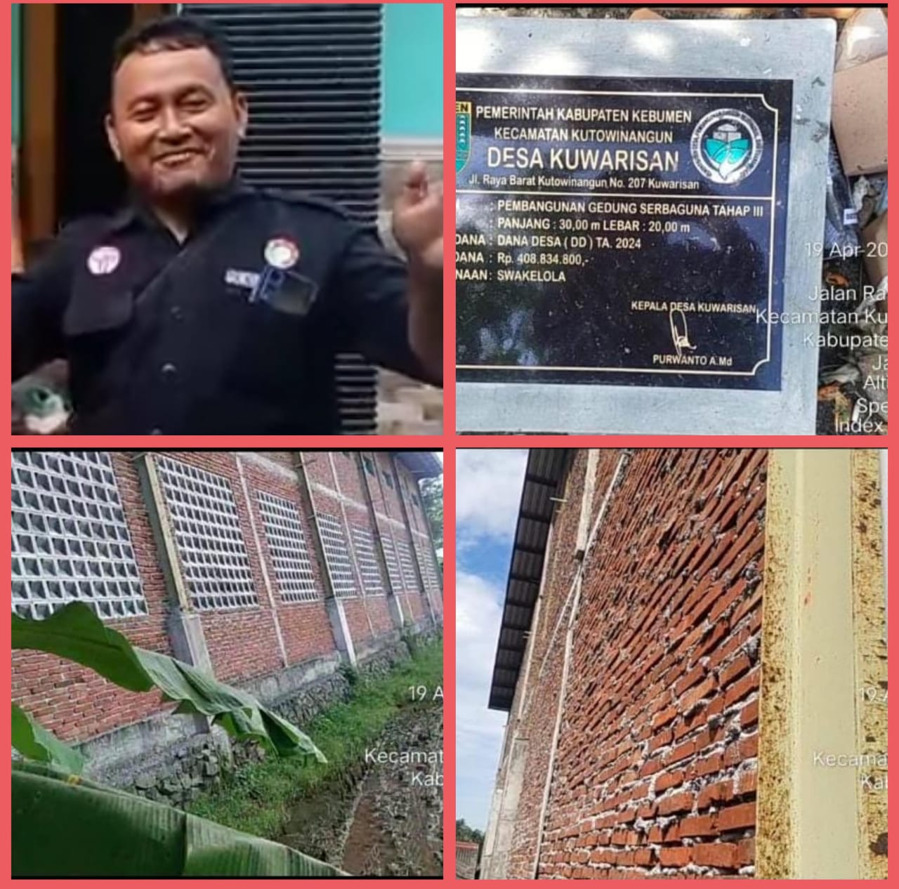 Kebumen, Jawa Tengah, porosnusantara.com- Pembangunan Gedung Serbaguna Desa Kewarisan, Kecamatan Kutowinangun, Kabupaten Kebumen, Jawa Tengah, menjadi sorotan publik karena penggunaan Dana Desa (DD) yang fantastis namun hasilnya dinilai tidak sebanding.