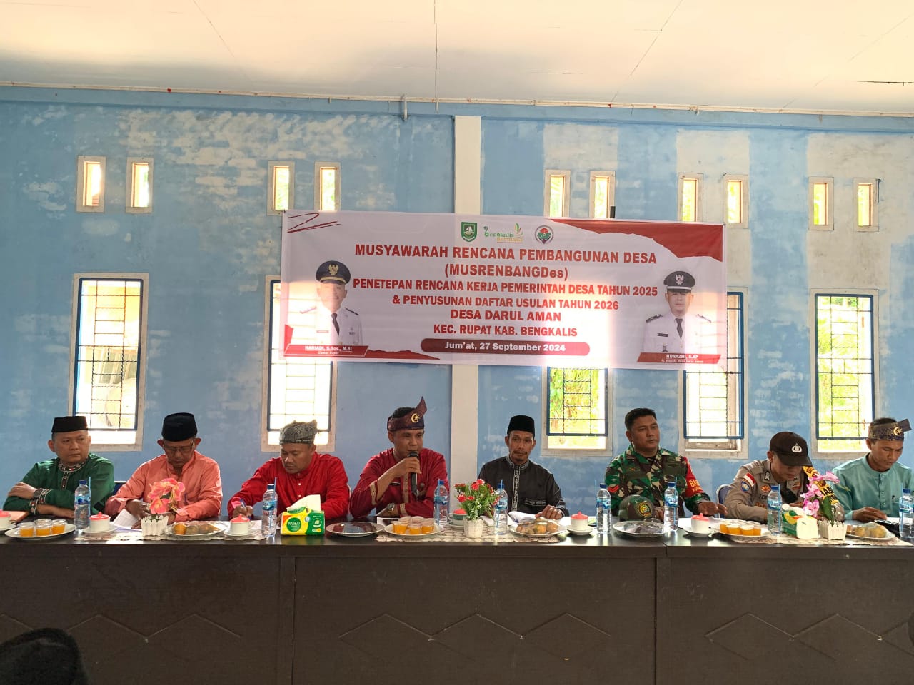 Pemerintahan desa Darul Aman Kecamatan Rupat Kabupaten Bengkalis menggelar musyawarah desa (musrenbangdes) dalam rangka penetapan rancangan rencana kerja pembangunan desa (RKPDES) tahun 2025 dan daftar usulan RKP desa DURKP tahun 2026, bertempat di aula kantor desa Darul Aman Jumat, 27-09-2024.