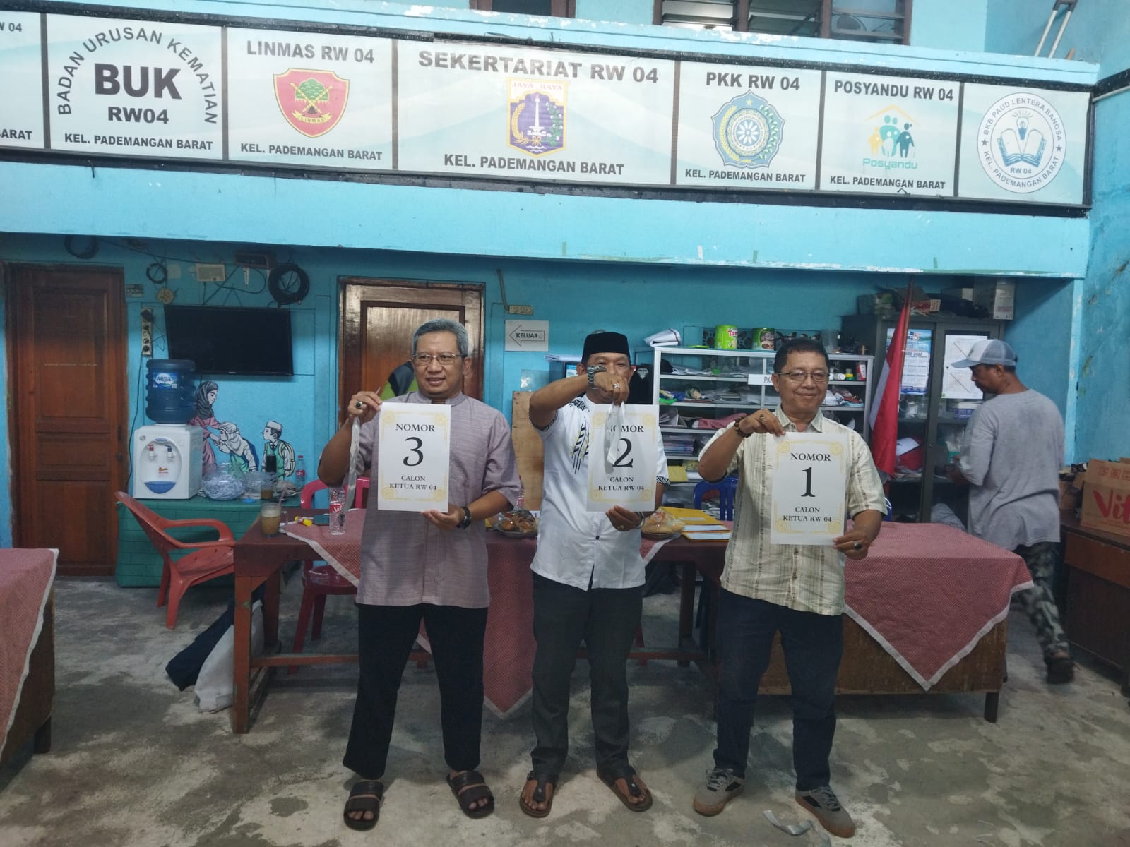 Ketua panitia pelaksana pemilihan RW 04, Ihsanul Takwim didampingi Ardi Hartomo sekretaris panitia, mengatakan pemilihan RW.04 akan dilaksanakan pada Minggu 18-05-2025 mendatang. Ada tiga bakal calon ketua RW. 04 yang akan bersaing dalam pemilihan minggu mendatang .
