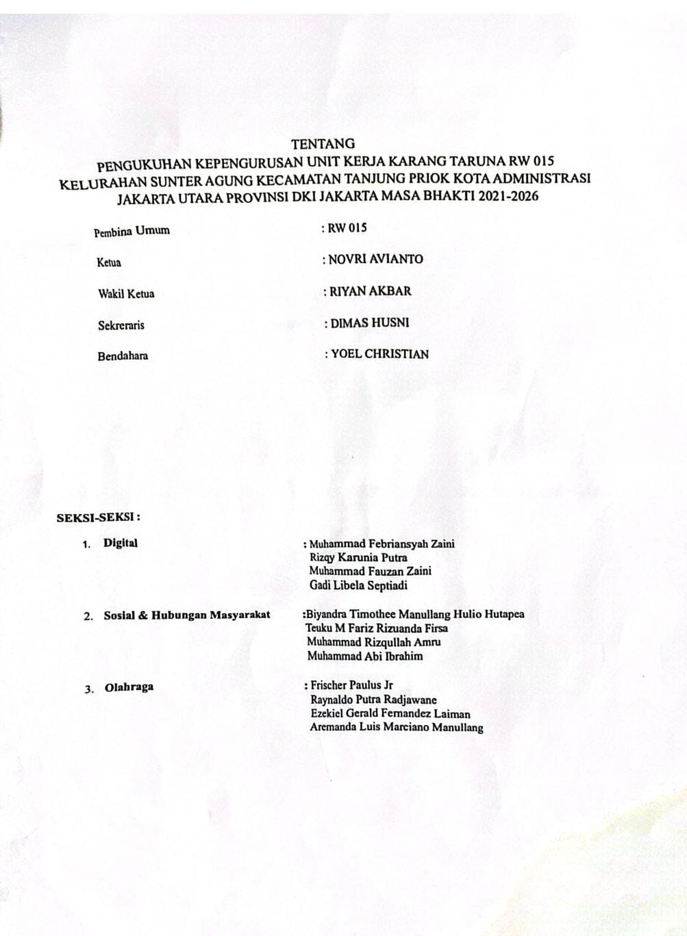Katar RW.15 yang dikomandoi Novri Avianto sudah di-SK-kan oleh ketua KATAR Sunter Agung, Aditya Rinaldy yang diketahui Lurah Sunter Agung, Teguh Subroto bernomor : 1.015/SK/KT-Kel/Sunter Agung/III/2025.