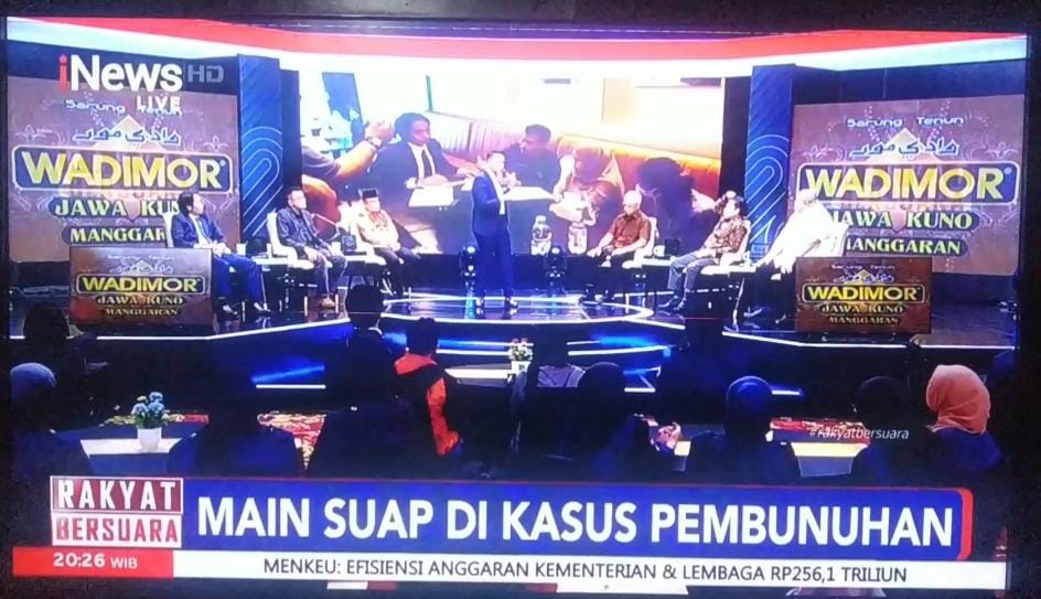 gkap dalam sebuah acara televisi swasta Nasional bertajuk Main Suap di Kasus Pembunuhan, Selasa malam, 4 Februari 2025. Dalam tayangan acara yang menghadirkan Ketua Harian Kompolnas, Arief Wicaksono Sudiotomo; Ketua IPW, Sugeng Santoso; dan Ahli Forensik Reza Indragiri, itu ditayangkan video berisi detik-detik penandatanganan perjanjian perdamaian antara keluarga korban dan keluarga tersangka disaksikan pengacara kedua belah pihak.