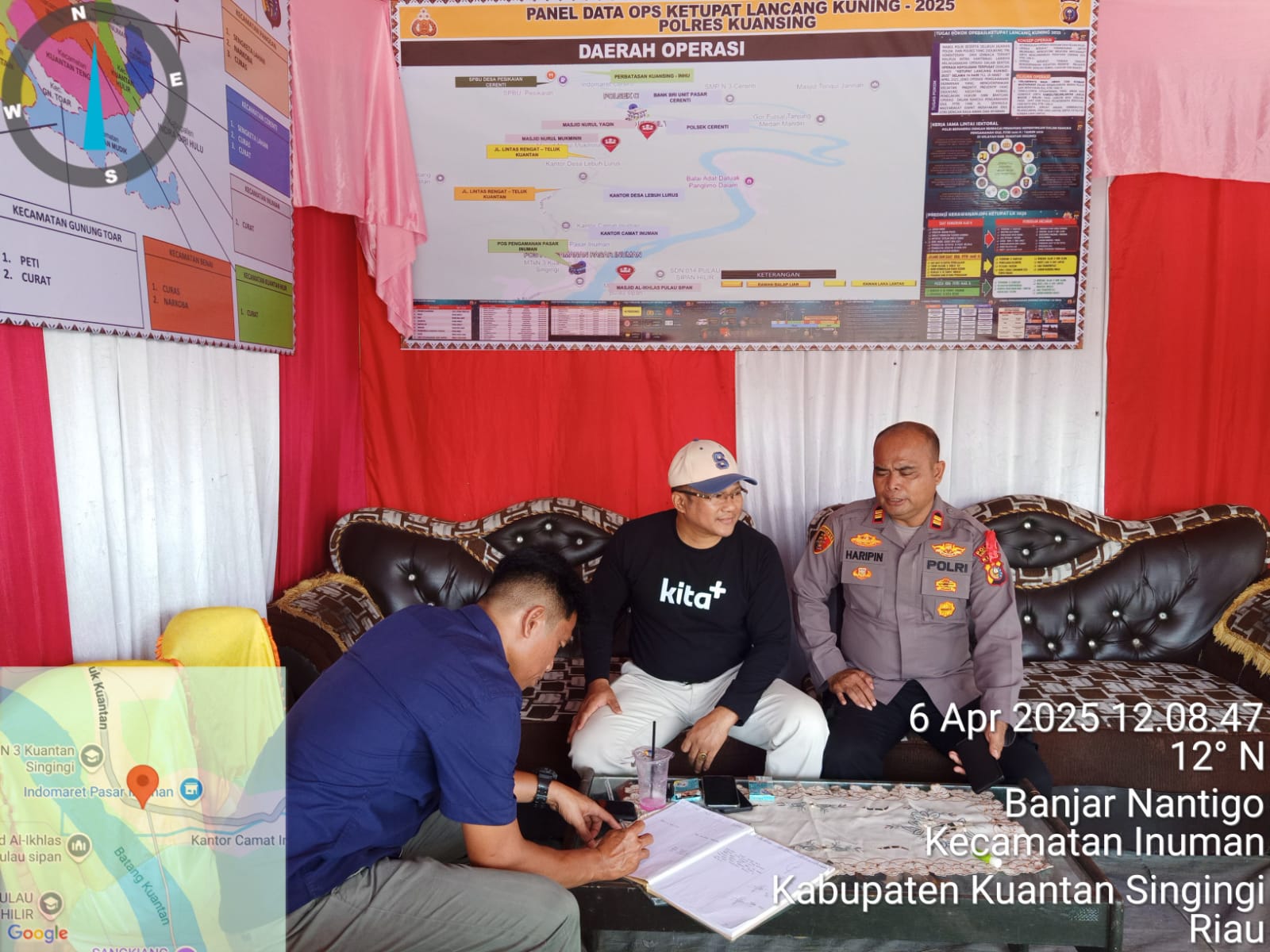 KUANTANSINGINGI, porosnusantara.com– Dalam rangka memastikan kesiapan dan optimalisasi pelaksanaan pengamanan selama Operasi Ketupat 2025, Polres Kuantan Singingi melalui Kasatgas Preemtif AKP Syurfanaidi, S.H., melaksanakan kegiatan supervisi dan asistensi terhadap situasi kamtibmas di Pos Pelayanan (Pos Yan) Pasar Inuman, Kecamatan Inuman, Minggu (6/4/2025).