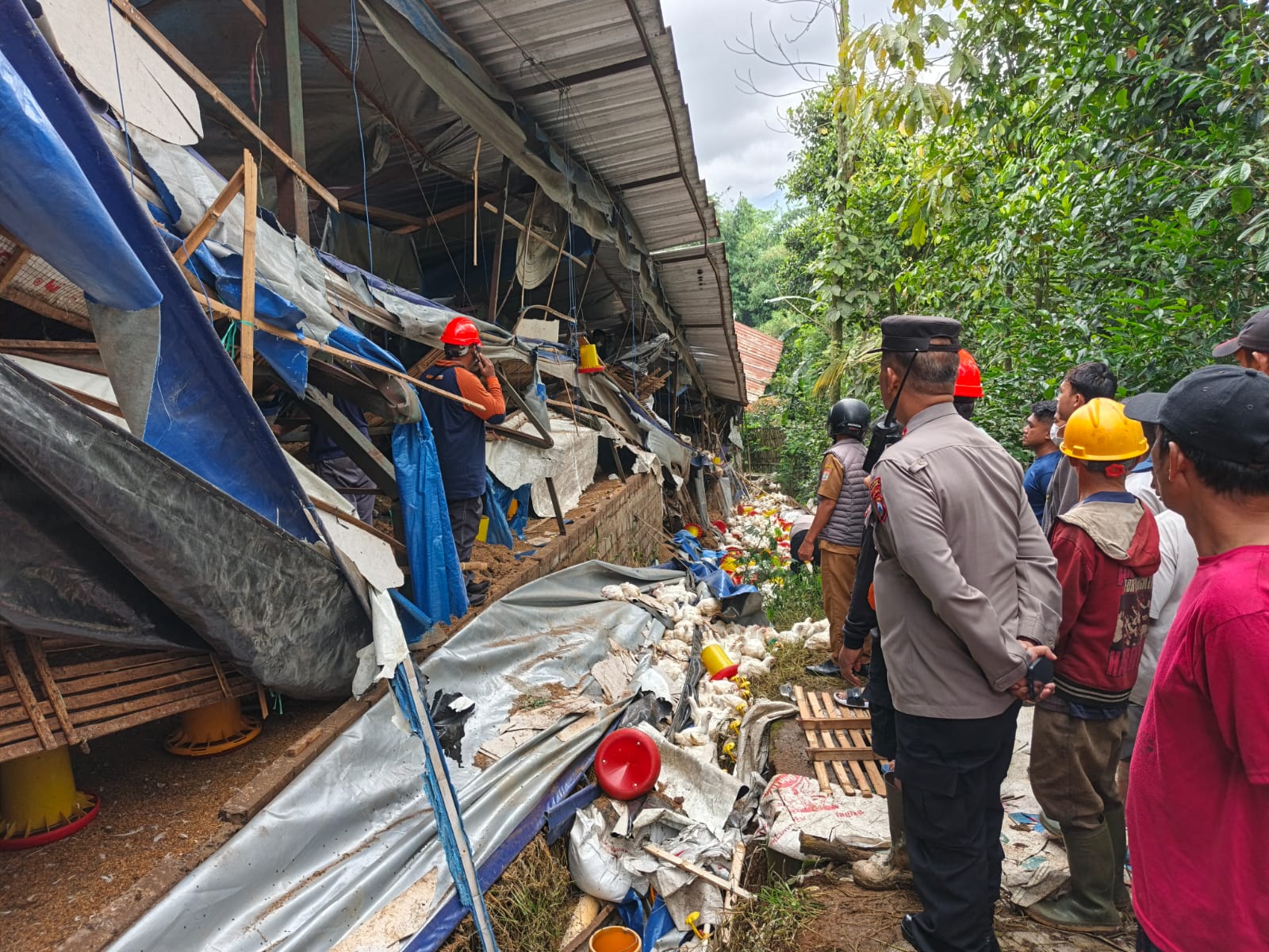 Kandang ambruk sekitar pukul 08.30 WIB saat lima pekerja berada di dalam bangunan. Struktur yang menggunakan penyangga kayu itu tiba-tiba runtuh dan menimpa para pekerja hingga terjebak material bangunan.