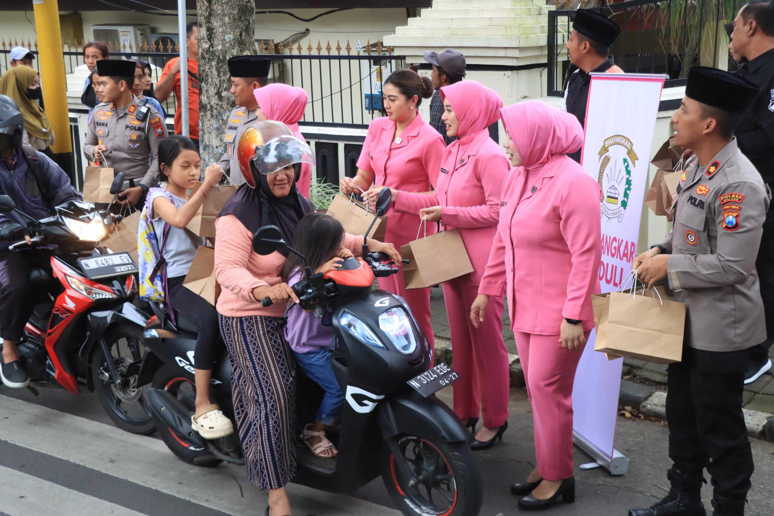 Sebanyak 350 paket takjil dibagikan kepada pengendara motor, mobil, hingga pejalan kaki yang melintas di depan kantor Polres Malang.