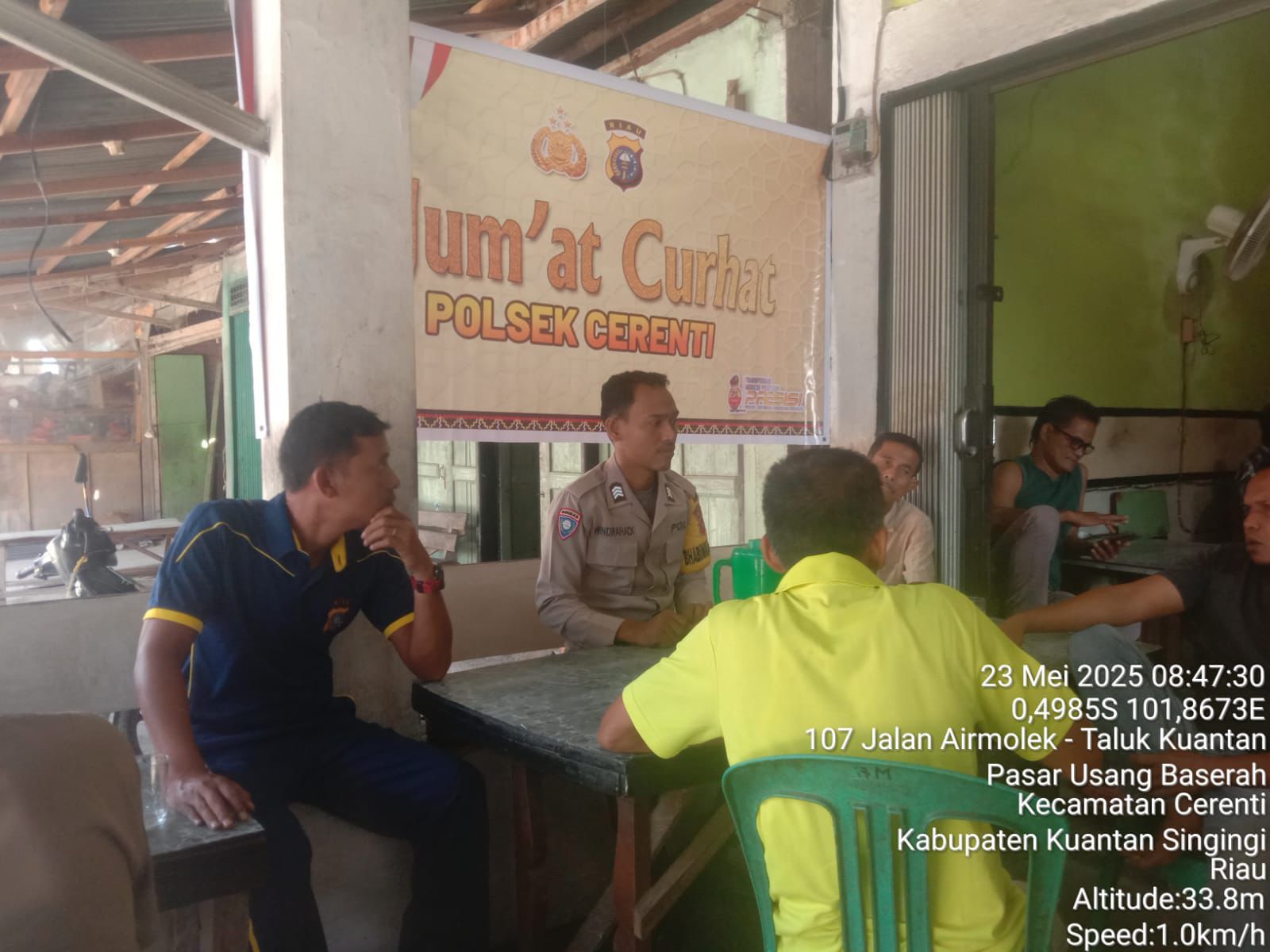 KUANTANSINGINGI | Porosnusantara.com – Dalam upaya mempererat hubungan antara Kepolisian dan masyarakat serta menjaga stabilitas keamanan dan ketertiban di wilayah hukumnya, Polsek Cerenti kembali melaksanakan kegiatan “Jumat Curhat” pada Jumat pagi (23/5/2025), sekitar pukul 08.40 WIB. Kegiatan ini berlangsung di Kelurahan Pasar Cerenti, Kecamatan Cerenti, Kabupaten Kuantan Singingi (Kuansing).