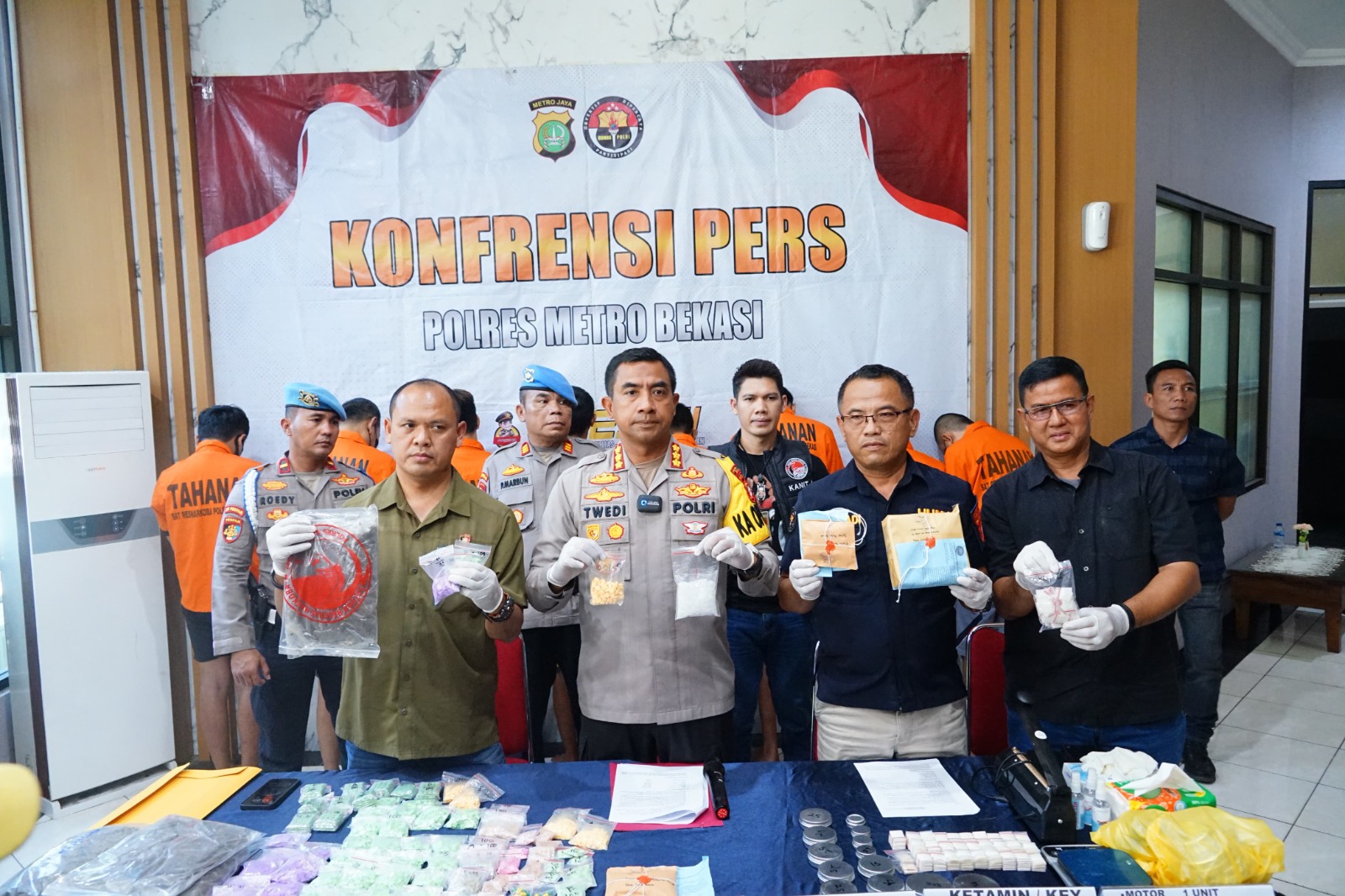 Dalam Konferensi Pers, Kapolres Metro Bekasi menjelaskan bahwa dalam operasi tersebut, pihak Kepolisian berhasil mengamankan sejumlah barang bukti, yaitu Sabu : 212,14 Gram, Ganja : 529,87 Gram, Sinte : 288,8 Gram, Bibit Sinte : 445 Gram, Ekstasi : 5.808 Butir, Obat Ketamin : 406 Gram, Motor : 1 Unit, Hp : 11 Unit, Timbangan Elektrik : 5 Buah Jika diakumulasikan dalam rupiah barang bukti seluruhnya setara dengan kurang lebih Rp. 7.073.242.545,- (Tujuh Miliyar Tujuh Puluh Tiga Juta Dua Ratus Empat Puluh Dua Ribu Lima Ratus Empat Puluh Lima Rupah)