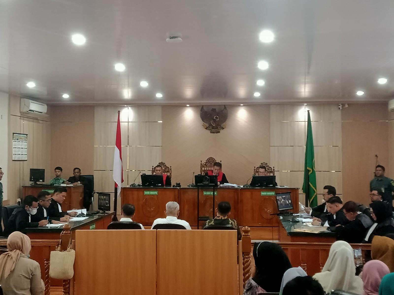 Majelis Hakim yang diketuai oleh Delta Tamtama, SH, duduk di bangku tinggi dengan wajah yang serius. Dua Hakim di sisinya, Azis Muslim, SH, dan Dr. Edi Darma Putra, SH, MH, juga tampak fokus mengikuti setiap kata yang keluar dari mulut jaksa. Tujuh orang JP.Budiman Abdul Karib, SH, MH, Irwan Ashadi,Tonny Frengky Pangaribuan,Diky Wahyu Ariyanto, Meyer Volmar Simanjuntak,