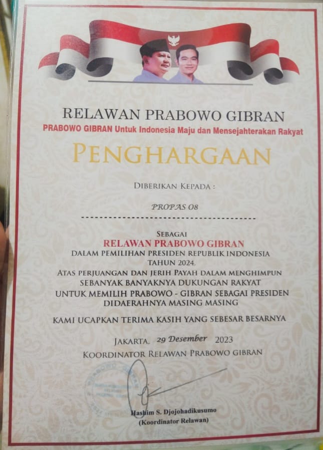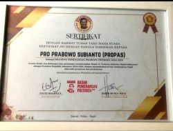 “Kami dari Relawan PROPAS PRO PRABOWO SUBIANTO mengucapkan syukur kepada Tuhan Yang Maha Esa dan selamat kepada Pak Prabowo dan Mas Gibran menjadi presiden dan wakil presiden terpilih dari hasil pemilu,” ujar ADI PRANATA SURYA KETUA UMUM DPP PROPAS saat ditemui awak media di Kantor Sekretariat DPP PROPAS Jalan Tomang Rawa Kepa XII No.127 Tomang Grogol Petamburan Jakarta Barat Senin 22/4/2024 kepada awak media.