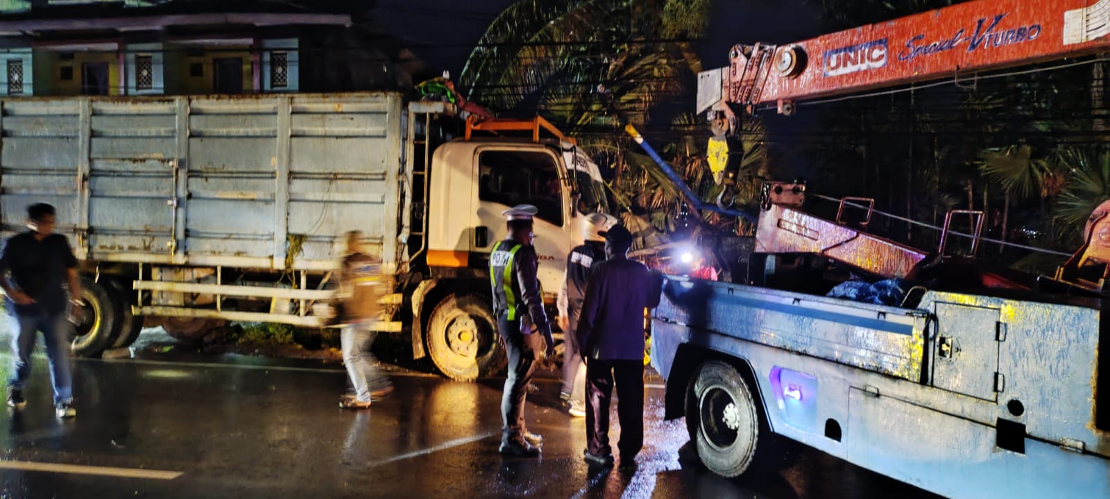 Laju truk baru terhenti setelah sopir membanting setir ke kiri dan menabrak tiang listrik di tepi jalan.